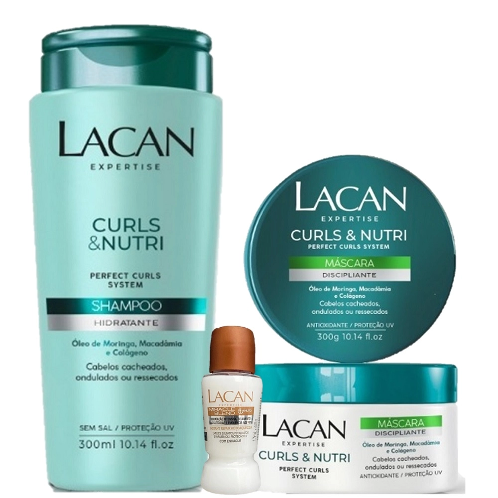 A linha Curls e Nutri Lacan à base de óleo de moringa, macadâmica e colágeno, nutrie e protege os cabelos cacheados, ondulados, crespos ou ressecados. Melhora a pentealidade, controla o colume e define os cachos. Fómula com tecnologia Perfect Curls System, combinação excluisva de ativos emolientes para promover máxima hidrtação aos fios. Este Kit Contém Lacan Curls e Nutri - Shampoo 300ml: promove higienização hidratante e ação desembaraçante. Lacan Curls e Nutri - Máscara Discipliante 300g: melhora a penteabilidade, controla o volume e define os cachos. Lacan Miracle Blend - Ampola 17ml: promove hidratação intensiva, selamento das cutículas e emoliência aos fios. Como Usar Conselho de Aplicação Shampoo: Aplicar no cabelo úmido, massageando o couro cabeludo, distribuindo suavemente o produto por toda extensão dos fios e enxaguar, repetir o procedimento, se necessário Máscara: No cabelo limpo e úmido, aplicar na extensão dos fios até as pontas, massageando os cabelos, deslizando os dedos entre os fios, deixar agir por cinco minutos e enxaguar. Ampola: Coloque uma pequena quantidade na palma da mão levemente úmida, friccione até ganhar consistência de chantilly, aplicar da extensão dos fios as pontas, deixe agir por 3 minutos ou mais. Enxaguar bem. Kit Lacan Curls e Nutri Cabelos Disciplinados (3 Produtos)