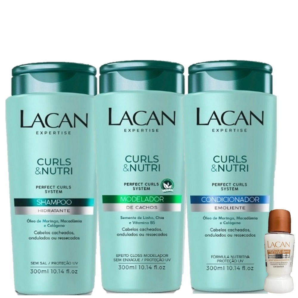 A linha Curls e Nutri Lacan à base de óleo de moringa, macadâmica e colágeno, nutrie e protege os cabelos cacheados, ondulados, crespos ou ressecados. Melhora a pentealidade, controla o colume e define os cachos. Fómula com tecnologia Perfect Curls System, combinação excluisva de ativos emolientes para promover máxima hidrtação aos fios. Este Kit Contém Lacan Curls e Nutri - Condicionador 300ml: promove emoliencia e melhora pentealidade. Lacan Curls e Nutri - Shampoo 300ml: promove higienização hidratante e ação desembaraçante. Lacan Curls e Nutri - Modelador 300ml: finaliza os cuidados de hidratação prolongada, promove proteção tripla: termoativa, antiumidade e UV Lacan Miracle Blend - Ampola 17ml: promove hidratação intensiva, selamento das cutículas e emoliência aos fios. Como Usar Conselho de Aplicação Shampoo: Aplicar no cabelo úmido, massageando o couro cabeludo, distribuindo suavemente o produto por toda extensão dos fios e enxaguar, repetir o procedimento, se necessário Condicionador: Aplicar na extensão dos fios até as pontas, massageando os cabelos e dezlizando os dedos enre os fios, enxaguar. Modelador: Com o cabelo úmido, aplicar em toda extensão dos fios e finalizar como de costume. Não é necessário enxaguar. Ampola: Coloque uma pequena quantidade na palma da mão levemente úmida, friccione até ganhar consistência de chantilly, aplicar da extensão dos fios as pontas, deixe agir por 3 minutos ou mais. Enxaguar bem.Kit Lacan Curls e Nutri Cachos Definidos (4 Produtos)