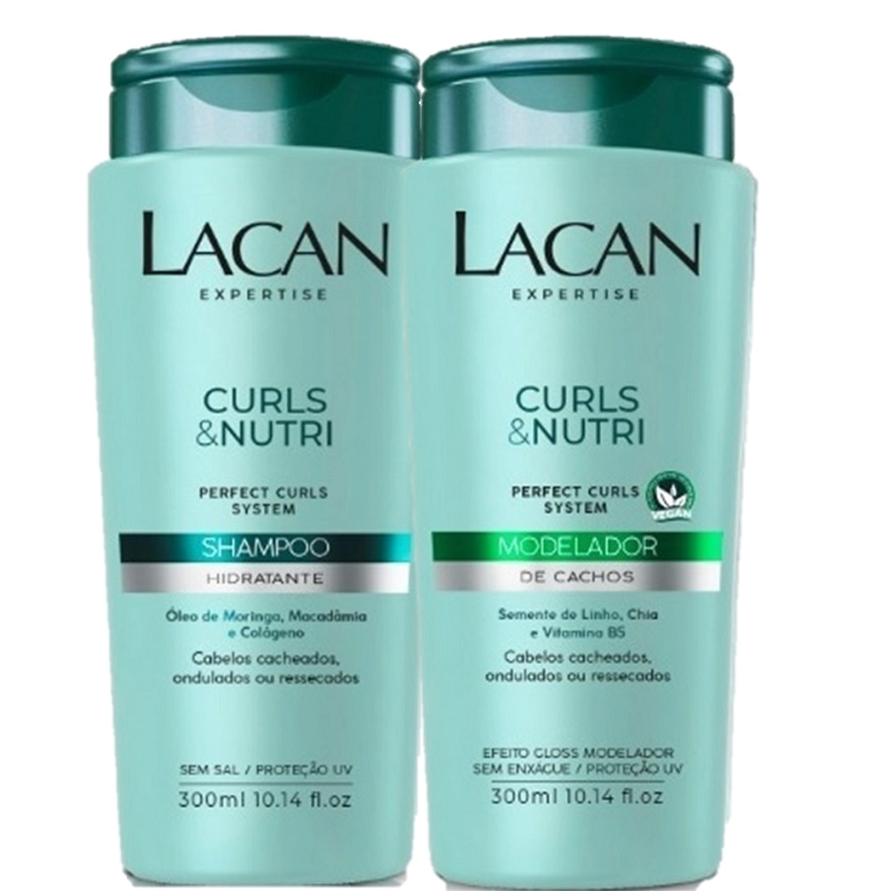 A linha Curls e Nutri Lacan à base de óleo de moringa, macadâmia e colágeno, nutre e protege os cabelos cacheados, ondulados, crespos ou ressecados. Melhora a pentealidade, controla o volume e define os cachos. Fórmula com tecnologia Perfect Curls System, combinação exclusiva de ativos emolientes para promover máxima hidratação aos fios. Este Kit Contém Lacan Curls e Nutri - Shampoo 300ml: promove higienização hidratante e ação desembaraçante. Lacan Curls e Nutri - Modelador 300ml: finaliza os cuidados de hidratação prolongada, promove proteção tripla: termoativa, antiumidade e UV Como Usar Conselho de Aplicação Shampoo: Aplicar no cabelo úmido, massageando o couro cabeludo, distribuindo suavemente o produto por toda extensão dos fios e enxaguar, repetir o procedimento, se necessário Condicionador: Aplicar na extensão dos fios até as pontas, massageando os cabelos e deslizando os dedos entre os fios, enxaguar.Kit Lacan Curls e Nutri Efeito Gloss (2 Produtos)