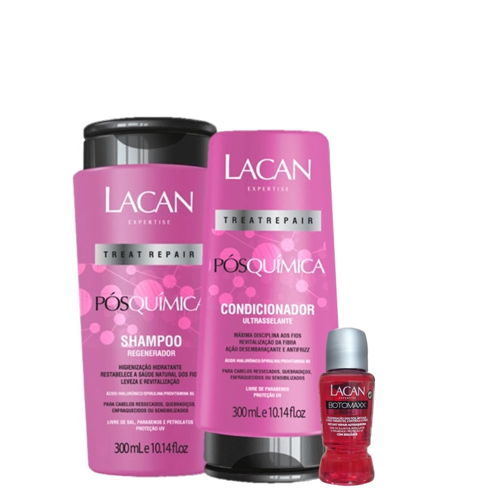 Kit Lacan Regenerador Pos Quimica Antiage (3 Produtos) Formulada com Ácido Hialurônico, Spirulina e Provitamina B5, possui a tecnologia Treat Repair – uma sinergia de ativos de altíssima qualidade, ricos em proteínas, vitaminas, sais minerais, açúcares e ácidos graxos, que nutrem e reparam os cabelos. Este Kit Contém Pós Química Shampoo 300ml: repara os cabelos danificados por processos químicos, mecânicos ou desgastes naturais, devolvendo densidade e maciez aos fios. Pós Química Condicionador 300ml: ação desembaraçante e antifrizz, condiciona e restabelece a saúde natural dos fios, deixando-os disciplinados. BotoMaxx Antiage Ampola 17ml: regenera os fios danificados, antiage, cor vibrante e controla o frizz Como Usar Conselho de Aplicação Aplique o Shampoo Regenerador para uma limpeza hidratante, massageie bem e enxágue. No cabelo limpo, aplicar o Condicionador Ultrasselante, deixe agir por alguns minutos e enxágue bem. Após lavar o cabelo com shampoo, na palma da mão levemente úmida, aplicar uma pequena quantidade do produto e friccionar até ganhar consistência de chantilly. Espalhar no cabelo do comprimento até as pontas e deixar agir por 3 minutos ou mais. Enxaguar bem.