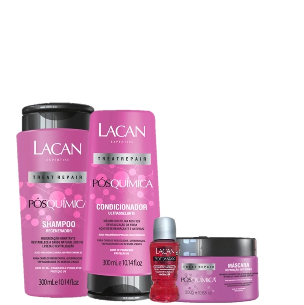 Formulada com Ácido Hialurônico, Spirulina e Provitamina B5, possui a tecnologia Treat Repair – uma sinergia de ativos de altíssima qualidade, ricos em proteínas, vitaminas, sais minerais, açúcares e ácidos graxos, que nutrem e reparam os cabelos. Este Kit Contém Pós Química Shampoo 300ml: repara os cabelos danificados por processos químicos, mecânicos ou desgastes naturais, devolvendo densidade e maciez aos fios. Pós Química Condicionador 300ml: ação desembaraçante e antifrizz, condiciona e restabelece a saúde natural dos fios, deixando-os disciplinados. Pós Química Máscara Capilar 300g: mascara de reconstrução capilar, aumenta a maciez, emolência e da um brilho extremo ao cabelo. BotoMaxx Antiage Ampola 17ml: regenera os fios danificados, antiage, cor vibrante e controla o frizz Como Usar Conselho de Aplicação Aplique o Shampoo Regenerador para uma limpeza hidratante, massageie bem e enxágue. No cabelo limpo, aplicar o Condicionador Ultrasselante, deixe agir por alguns minutos e enxágue bem. Após lavar os cabelos, aplique a máscara. Deixe agir por 3 á 5 minutos. Enxaguar bem. Após lavar o cabelo com shampoo, na palma da mão levemente úmida, aplicar uma pequena quantidade do produto e friccionar até ganhar consistência de chantilly. Espalhar no cabelo do comprimento até as pontas e deixar agir por 3 minutos ou mais. Enxaguar bem.Kit Lacan Regenerador Pos Quimica Antiage (4 Produtos)