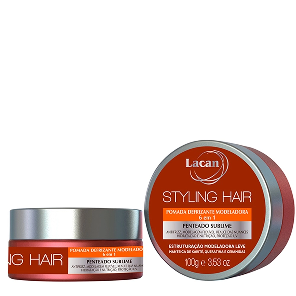 Proteger e hidratar os fios com proteína termoativada que também deixa os fios lisos por mais tempo. Finaliza o penteado com hidratação e proteína termoativada.Kit Lacan Styling Hair - Pomada Defrizante Modeladora 100g (2 Unidades)