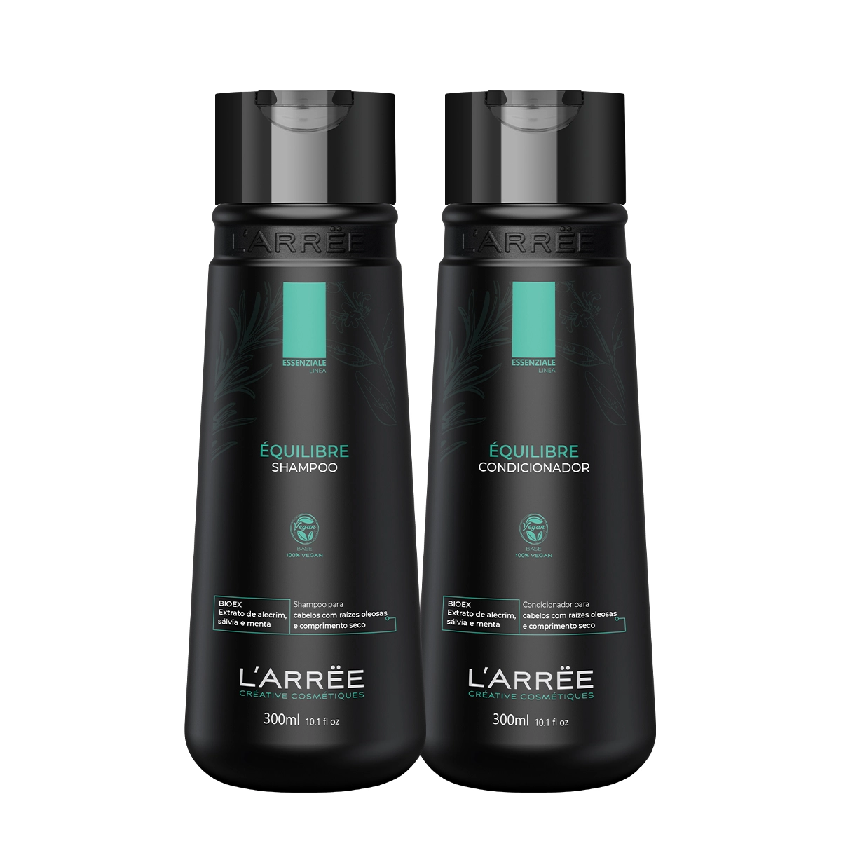 Esse Kit Contém LARREE Équilibre - Shampoo 300ml: para cabelos com raízes oleosas limpa o couro cabeludo e equilibra o excesso de oleosidade da raiz. tem uma fórmula vegana que contém Bioex, Óleos Essenciais de Sálvia, Alecrim e Menta que auxiliam na prevenção da caspa, devolvem a vitalidade e recuperam o equilíbrio dos fios. Indispensável para seu ritual de cuidados com as madeixas. LARREE Essenziale Équilibre - Condicionador 300ml: para cabelos com raízes oleosas revitaliza e hidrata os fios, equilibrando a umidade natural. tem uma fórmula vegana enriquecida com Colágeno, Queratina e Pantenol, que ajudam a aumentar a flexibilidade, reparam a estrutura das madeixas e restauram o cabelo. Ideal para a rotina de cuidados com as madeixas! Conselho de AplicaçãoKit L'ARRËE Équilibre Duo (2 produtos)