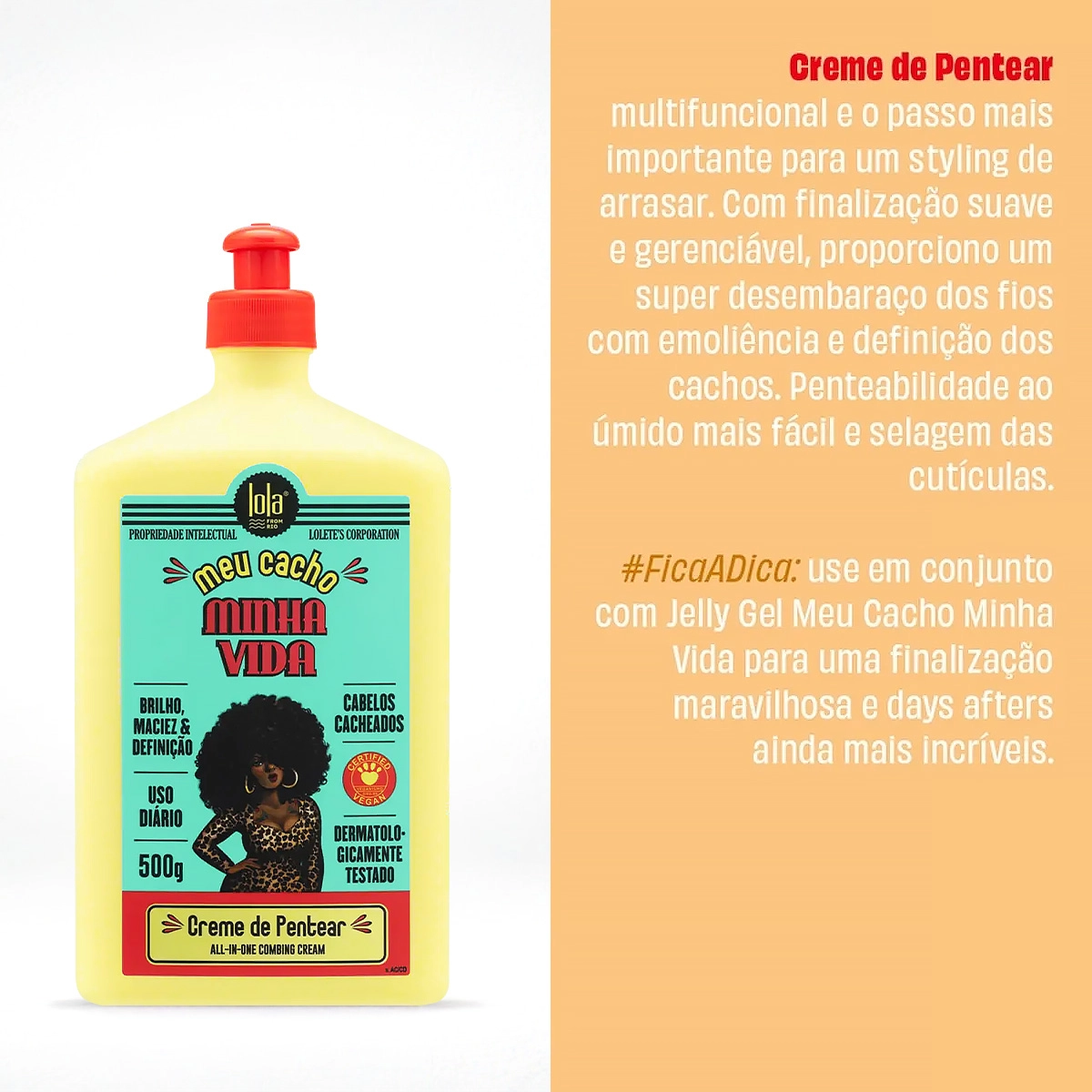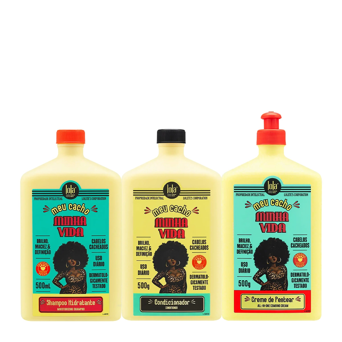 Este Kit Contém Lola From Rio Meu Cacho Minha Vida - Shampoo 500ml: aumenta a umidade natural dos fios, deixando-os vibrantes e higienizados. Realiza uma limpeza delicada, emoliente e hidratante, que deixa os cachos saudáveis e radiantes. Possui fórmula rica em ativos umectantes, que suavizam o cabelo. Lola From Rio Meu Cacho Minha Vida - Condicionador 500ml: reestabelece a umidade do fio, nutrindo e condicionando. Restaura os danos sofridos na fibra capilar, devolvendo emoliência, definição e movimento aos cachos. Com textura leve, suaviza e hidrata os fios. Lola From Rio Meu Cacho Minha Vida - Creme para Pentear 500ml: condiciona e define os cachos. Multifuncional, pode ser utilizado como leave-in, umidificador, memorizador e ativador de cachos. Proporciona uma finalização suave e gerenciável, além de desembaraçar, suavizar e selar as cutículas. Conselho de AplicaçãoKit Lola From Rio Meu Cacho Minha Vida Duo Creme (3 produtos)