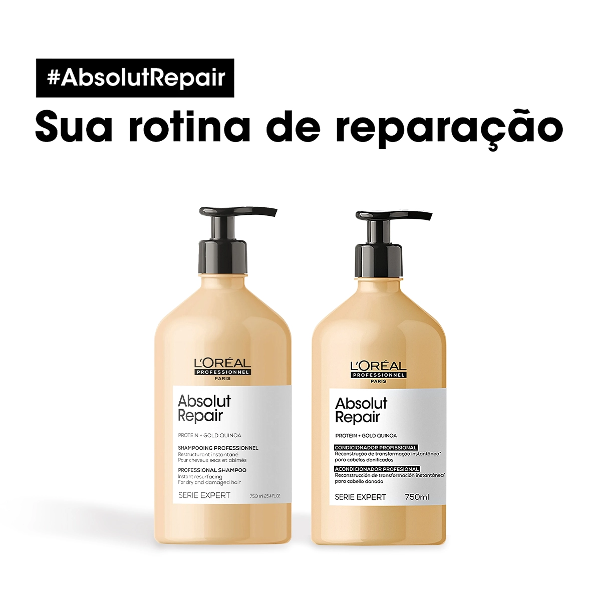 Esse Kit Contém L'Oréal Professionnel Serie Expert Absolut Repair Gold Quinoa Protein - Shampoo 750ml: para cabelos danificados. reestrutura a fibra capilar, confere brilho e leveza durante a limpeza diária dos fios. traz ativos que ajudam restaurar a superfície dos fios para que o cabelo revele uma aparência mais saudável. Com shampoo Absolut Repair seu visual ganha muito mais brilho e um toque macio incrível. L'Oréal Professionnel Serie Expert Absolut Repair Gold Quinoa Protein - Condicionador 750ml: para cabelos danificados desembaraça e reestrutura a superfície do fio para mais brilho e leveza traz ativos que ajudam restaurar a superfície dos fios para que o cabelo revele uma aparência mais saudável. Seu visual ganha muito mais luminosidade e um toque sedoso incrível. L'Oréal Professionnel Serie Expert Absolut Repair Gold Quinoa Protein Golden - Máscara Capilar 500ml: tratamento em creme-gel para cabelos danificados. Por ter textura leve, restaura sem pesar, até mesmo os fios mais finos. Deixa o cabelo mais suave e com brilho intenso, perfeito para quem precisa tratar, mas não gosta da sensação de peso pós tratamento. A fórmula dourada atua na reparação da fibra capilar para que o cabelo revele uma aparência mais saudável. Sua textura inovadora permite unir o poder de tratamento dos ativos com a leveza de um gel, e as partículas douradas conferem brilho intenso aos fios. L'Oréal Professionnel Serie Expert Absolut Repair Gold Quinoa 10in1 - Óleo Reparador 90ml: reparador para cabelos finos, ressecados e danificados proporciona 10 benefícios para o cabelo, com resultado de fios nutridos, brilhantes e leves, com toque suave.foi desenvolvido especialmente para cabelos danificados. Seus principais ingredientes, a Quinoa Dourada e Proteína Hidrolisada de Trigo, criam um filme protetor que mantém as cutículas seladas, retendo as propriedades restauradoras dentro da fibra capilar. L'Oréal Professionnel Expert Absolut Repair Cortex Lipidium Power Repair - Ampola Capilar 10ml: para cabelos extremamente danificados. Repara desde o interior, devolvendo brilho, maciez e proteção. Com alta concentração de nutrientes, penetra de imediato na fibra capilar, reconstruindo instantaneamente as zonas sensibilizadas. Também cria uma barreira isolante que retém os nutrientes essenciais, protegendo e mantendo a fibra a salva de novos danos. Conselho de AplicaçãoKit L'Oréal Professionnel Absolut Repair Gold Quinoa Protein Shampoo Condicionador Máscara G Óleo e Power Repair (5 produtos)