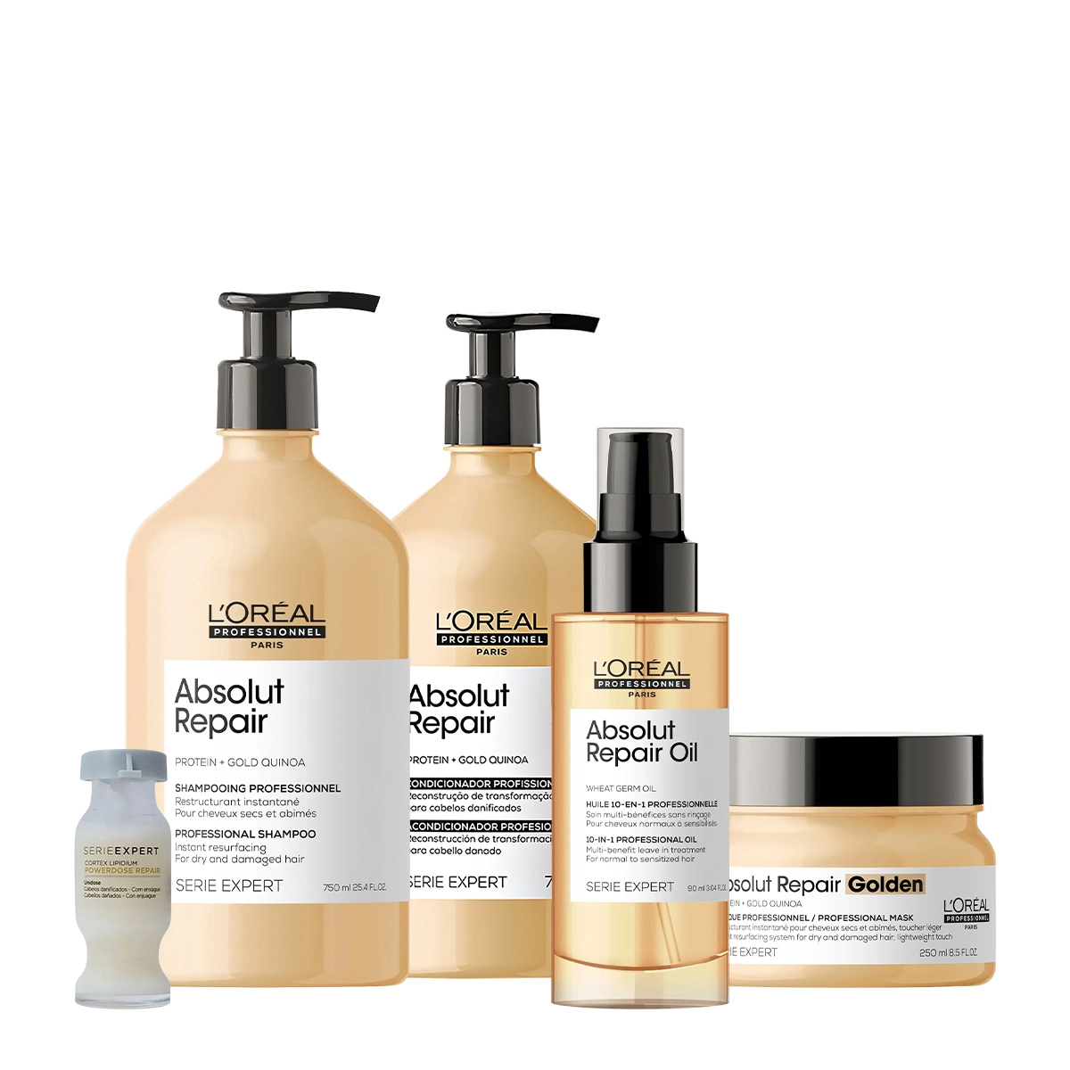 Kit L'Oréal Professionnel Absolut Repair Gold Quinoa Protein Shampoo Condicionador Máscara Óleo e Power Repair (5 produt