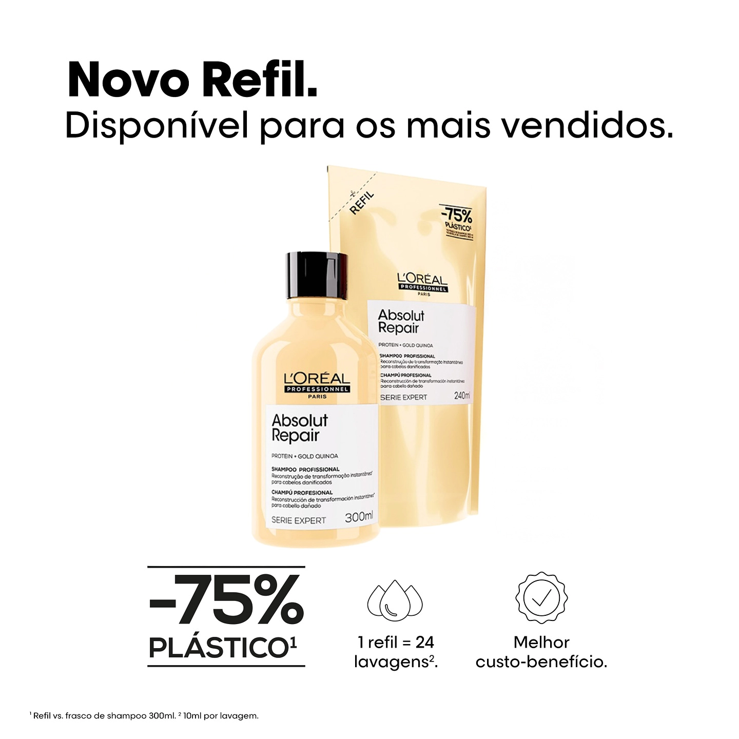 Esse Kit Contém L'Oréal Professionnel Serie Expert Absolut Repair Gold Quinoa Protein - Shampoo 300ml: reestrutura a fibra capilar, confere brilho e leveza durante a limpeza diária dos fios. Seus ativos que ajudam restaurar a superfície dos fios para que o cabelo revele uma aparência mais saudável. L'Oréal Professionnel Serie Expert Absolut Repair Gold Quinoa Protein Refil - Shampoo 240ml: reestrutura a fibra capilar, confere brilho e leveza durante a limpeza diária dos fios. Seus ativos que ajudam restaurar a superfície dos fios para que o cabelo revele uma aparência mais saudável. Kit L'Oréal Professionnel Absolut Repair Gold Shampoo Extra Refil (2 produtos)