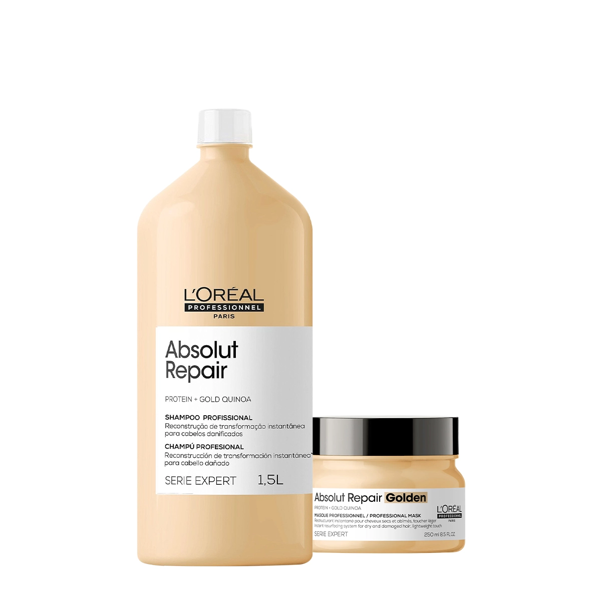 Esse Kit Contém L'Oréal Professionnel Serie Expert Absolut Repair Gold Quinoa Protein - Shampoo 1,5L: reestrutura a fibra capilar, confere brilho e leveza durante a limpeza diária dos fios. Seus ativos que ajudam restaurar a superfície dos fios para que o cabelo revele uma aparência mais saudável. L'Oréal Professionnel Serie Expert Absolut Repair Gold Quinoa Protein Golden - Máscara Capilar 250ml: restaura sem pesar, até mesmo os fios mais finos. Sua fórmula repara a fibra capilar, com textura inovadora, une o poder de tratamento dos ativos com a leveza de um gel. Suas partículas douradas conferem brilho intenso aos fios.Kit L'Oréal Professionnel Absolut Repair Golden Shampoo Máscara 250 (2 produtos)