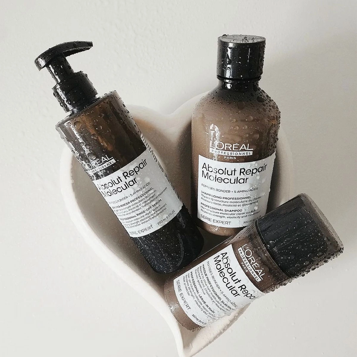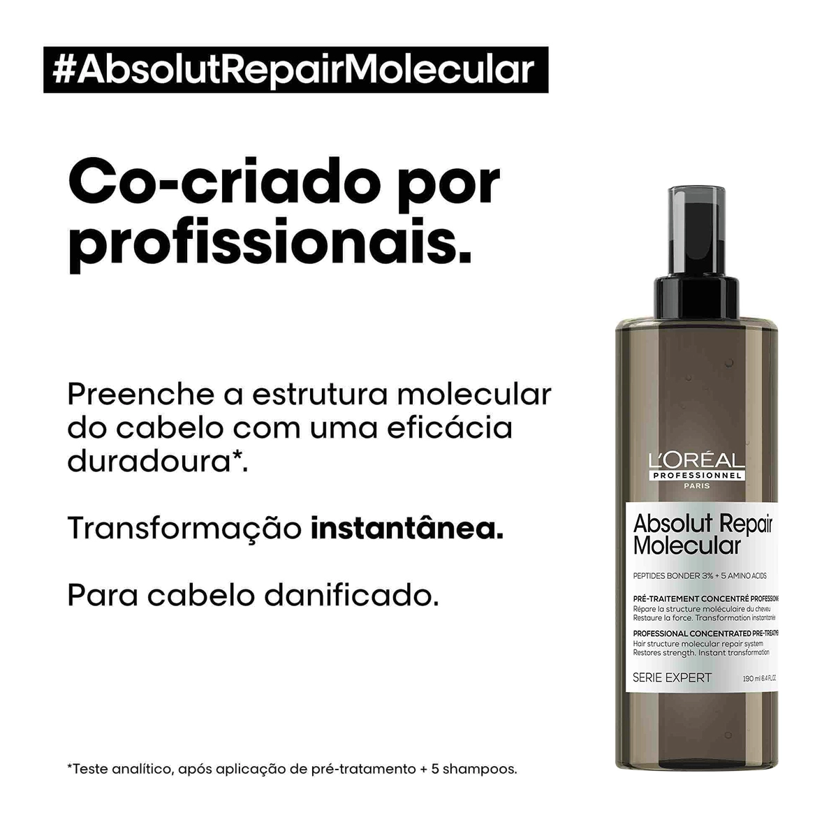 L'Oréal Absolut Repair Molecular - Pré-Tratamento 190ml: para todos os tipos de cabelos danificados. Promove uma fibra capilar restaurada e o fácil desembaraço dos fios. Recarrega a estrutura molecular do cabelo com uma eficácia duradoura. Com tecnologia exclusiva que permite a decomposição dos peptídeos em seus componentes fundamentais, que são injetados diretamente nas fibras capilares. Resultando na reconstrução completa da estrutura molecular cabelo, devolvendo-lhe a força e vitalidade. Possui textura líquida, de rápida absorção pela fibra, reparando sem pesar nos fios. L'Oréal Professionnel Absolut Repair Molecular - Shampoo 500ml: repara a estrutura macromolecular do fio, promovendo força, nutrição, movimento e maciez. Ele é uma inovação da L'Oréal Advanced Research, desenvolvida para revitalizar o cabelo de maneira nunca vista antes. Revolucionária reconstrução completa da estrutura molecular do cabelo. Ideal para todos os tipos de cabelos danificados, sejam coloridos, descoloridos ou naturais. L'Oréal Professionnel Absolut Repair Molecular - Máscara Capilar 250g: para cabelos danificados, repara e reconstrói profundamente a estrutura molecular do cabelo. Com fórmula exclusiva que repara 2 anos de danos a partir da primeira aplicação, tecnologia que decompõe os peptídeos, possibilitando que penetrem na fibra capilar e reconstruam a estrutura molecular do cabelo. Confere fios mais fortes, com elasticidade, movimento e maciez. L'Oréal Professionnel Absolut Repair Molecular - Leave-in 100ml: para cabelos danificados. Proporciona reparação profunda enquanto restaura a fibra capilar. Reconstrução completa da estrutura molecular do cabelo, devolvendo a força e a vitalidade. Conta com proteção térmica de até 230°C. L'Oréal Professionnel Absolut Repair Molecular - Sérum Capilar 250ml: restaura a força, flexibilidade e o movimento do fio. Ele foi inspirado nos séruns ultra potentes para a pele e penetra profundamente na fibra capilar para reconstruir sua estrutura molecular. Possui textura líquida que é imediatamente absorvida pela fibra e proporciona reparo molecular sem pesar no fio. Conselho de AplicaçãoKit L'Oréal Professionnel Absolut Repair Molecular Hair Care Total 250 (5 produtos)