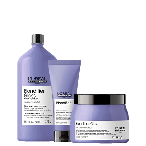 LOreal Professionnel Kit Blondifier Gloss Reparador 3 Produtos Kit de tratamento para cabelos loiros, com descoloração ou mechas. Kit L’Oréal Professionnel Blondifier Gloss Trio mantém os fios iluminados e saudáveis. Repara, protege e conserva a cor. Kit L’Oréal Professionnel Blondifier Gloss Trio conta com fórmulas ricas em polifenóis antioxidantes, que restauram agressões do dia a dia e da química. Sela cutículas e garante muito mais brilho enquanto nutre e mantém os fios alinhados. Contém L'Oréal Professionnel Serie Expert Blondifier Gloss - Shampoo 1,5L: sua fórmula suave limpa delicadamente, sem ressecar ou agredir, enquanto protege dos danos diários. L'Oréal Professionnel Serie Expert Blondifier - Condicionador 200ml: garante muito mais brilho e maciez porque equilibre o pH dos fios e sela cutículas. Repara danos diários e reacende a cor. L'Oréal Professionnel Serie Expert Blondifier Gloss - Máscara Capilar 500g: repara fios danificados ao preencher áreas porosas e traz maciez intensa. Conselho de Aplicação No cabelo molhado, aplique o shampoo e massageie delicadamente o couro cabeludo. Enxágue ao formar espuma e repita o processo se achar necessário. Retire o excesso de água e passe a máscara. Espalhe homogeneamente pelo comprimento e pontas, massageando as mechas e deixe agir por alguns minutos. Depois, enxágue completamente. Termine com o condicionador por toda a extensão dos fios, menos na raiz. Penteie bem com os dedos e enxágue