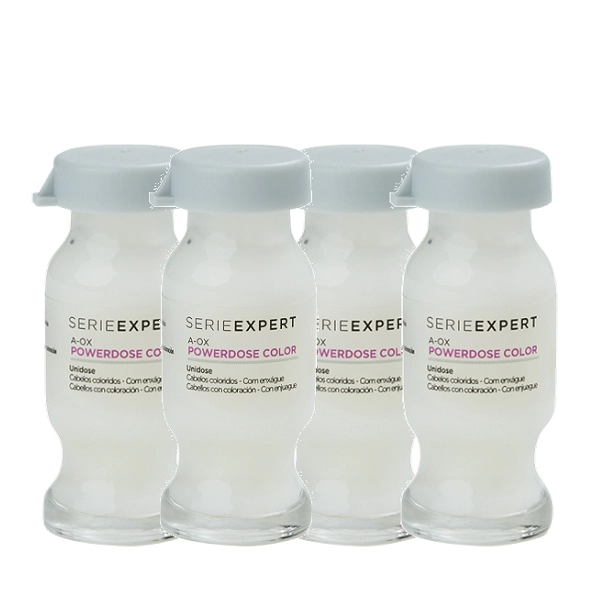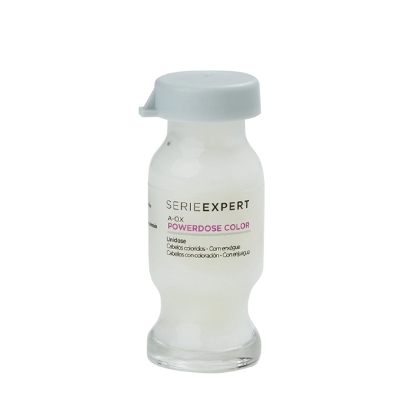 Ampola de tratamento para cabelos coloridos. L'Oréal Professionnel Vitamino Color A.OX Powerdose fixa e potencializa a tonalidade, enquanto combate o o desbotamento e adiciona brilho intenso. Ação Neohespiridina e Tocoferol: antioxidantes essenciais para a proteção da pele. Eles são os responsáveis por combater o desbotamento e o desgaste da cor, enquanto nutre as fibras capilares. Conselho de Aplicação Aplique a ampola por todo o cabelo limpo e úmido e massageie bem. Deixe agir por alguns minutos e enxágue. Para melhores resultados, peça ajuda ao seu cabeleireiro de confiança sobre o melhor modo de aplicação para a sua necessidade. Resultado Seus fios hidratados e nutridos ganham brilho, resistência e maciez. A cor é protegida, mantida e intensificada!
