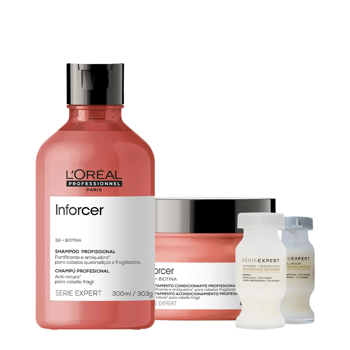 Este Kit Contém L'Oréal Professionnel Inforcer Serie Expert - Shampoo 300ml: funciona como um suplemento capilar de força com prevenção a quebra. Deixa o cabelo mais forte, saudável, com brilho e maciez. L'Oréal Professionnel Inforcer Serie Expert - Máscara 250ml: promove um tratamento nutritivo profundo que suplementa a fibra capilar e a torna mais forte. L'Oréal Professionnel Expert Absolut Repair Cortex Lipidium Power Repair - Ampola Capilar 10ml: para cabelos extremamente danificados. Repara desde o interior, devolvendo brilho, maciez e proteção. Com alta concentração de nutrientes, penetra de imediato na fibra capilar, reconstruindo instantaneamente as zonas sensibilizadas. Também cria uma barreira isolante que retém os nutrientes essenciais, protegendo e mantendo a fibra a salva de novos danos. L'Oréal Professionel Nutrifier Power - Ampola de Nutrição 10ml: tratamento para cabelos ressecados é uma dose intensa de nutrição e hidratação que recupera o brilho contém alta concentração de nutrientes e hidratantes que penetram profundamente na fibra capilar e eliminam o aspecto sem vida, áspero e opaco dos fios. Conselho de AplicaçãoKit L'Oréal Professionnel Inforcer Serie Expert Shampoo Máscara e Ampolas Absolut Repair (4 produtos)