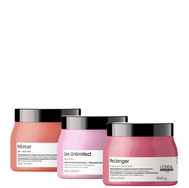 LOreal Professionnel Kit Mascaras Liss Unlimited Pro Longer e Inforcer 500g Contém 1 Máscara Liss Unlimited 500g. 1 Máscara Pro Longer 500g 1 Máscara Inforcer 500g. L'Oréal Professionnel Expert Liss UnlimitedMáscara de tratamento para cabelos rebeldes ou com frizz, em tamanho salão. A fórmula do L'Oréal Professionnel Liss Unlimited Tratamento Intensivo promove hidratação intensa e nutre as fibras capilares. Ela ainda fortalece e ajuda na reparação dos fios. Máscara de tratamento para cabelos longos com pontas afinadas ou danificadas. L'Oréal Professionnel Serie Expert Pro Longer hidrata e devolve densidade aos fios. Com ação renovadora, a Máscara L'Oréal Professionnel Serie Expert Pro Longer confere uma redução de até 66% das pontas duplas, graças a sua fórmula que contém ativos poderosos e inovadores. O resultado que a máscara L'Oréal Pro Longer entrega é um cabelo longo mais forte, denso, com brilho e preenchimento de pontas danificadas e afinadas. Conselho de Aplicação Aplique sua L'Oréal Pro Longer, concentrando a máscara no cabelo lavado e úmido, após utilização do shampoo. Deixar agir por 3 a 5 minutos. Enxágue bem. Nossos Experts Ensinam Dica de tratamento: o Condicionador L'Oréal Professionnel Serie Expert Pro Longer pode ser usado após a máscara de tratamento para selar as cutículas do cabelo. L'Oréal Professionnel Inforcer Serie Expert Máscara para cabelos frágeis e quebradiços. L'Oréal Professionnel Inforcer Serie Expert estimula o crescimento dos fios já existentes contra quebra e com resistência. Tratamento nutritivo profundo que funciona como suplemento para o cabelo. Inforcer L'Oréal dá força para o crescimento saudável e prevenção a quebra. Um tratamento intenso ideal para quem está querendo deixar os cabelos compridos. Experimente e encante-se com os resultados da Máscara Inforcer, da Serie Expert L'Oréal. Conselho de Aplicação Depois de lavar o cabelo, retire a umidade excessiva dos fios. Então, aplique a máscara pelo comprimento e pontas. Massageie mecha a mecha, deslizando as mãos no sentido do crescimento do cabelo, com o movimento de enluvá-lo. Espalhe bem. Deixe agir no cabelo por 5 minutos. Em seguida, enxágue completamente.