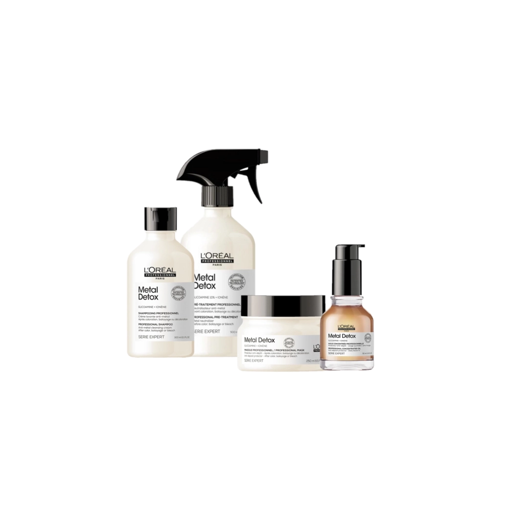 Este Kit Contém L’Oréal Professionnel Metal Detox - Shampoo 300ml: para cabelos coloridos e danificados, remove gentilmente partículas de metal do cabelo, graças à tecnologia patenteada, enriquecida com Glicoamina, a molécula que rastreia e neutraliza o metal dentro da fibra capilar. Promove maciez, brilho, sedosidade, maior durabilidade da cor, com textura rica e cremosa, livre de sulfato. L’Oréal Professionnel Metal Detox - Máscara Capilar 250ml: para cabelos coloridos e danificados, é a primeira máscara protetora anti-depósito a proteger o cabelo do depósito de partículas de metal. Proporciona um cabelo menos poroso e um tratamento para maciez, brilho e sedosidade, maior durabilidade da cor, com textura rica e cremosa. L’Oréal ProfessionnelMetal Detox Huile - Óleo Capilar 50ml: óleo concentrado protetor anti-depósitos rico em glicoamina, ajuda a proteger o cabelo do depósito de partículas. Sua textura é instantaneamente absorvida pela fibra capilar sem pesar. A cor fica mais brilhante e intensa. O cabelo fica mais nutrido e forte. L'Oréal Professionnel Metal Detox - Spray Neutralizador Anti-Metal 500ml: pré tratamento neutralizador antimetal para cabelos coloridos e danificados. Protege a fibra antes de cada serviço ao neutralizar o excesso de cobre, graças a tecnologia patenteada, enriquecida com Glicoamine e Lonene. Pode ser utilizada antes de qualquer serviço profissional de coloração, de oxidação, balayage ou descoloração, isso permite uma ótima absorção da cor não afeta o processo, a integridade da fibra fica preservada. Conselho de Aplicação Shampoo: aplique uniformemente no cabelo molhado. Massageie até que uma espuma rica se forme. Enxague bem. Máscara: aplique no cabelo lavado após o shampoo, deixe agir por 1 minuto e enxague. Óleo: aplicar diariamente no cabelo seco ou seco com toalha. Aqueça 1-2 pumps na palma da mão e espalhe uniformemente dos meios para as pontas. Não enxaguar. Prossiga a secagem com secador ou ar. Spray: divida os cabelos em quatro quadrantes. Comece borrifando o spray pré-tratamento no cabelo da raiz até as pontas. Nos cabelos curtos borrife de 8 a 10 pumps; nos cabelos médios e longos borrife de 15 a 20 pumps. Espalhe bem e penteie o cabelo para distribuir o produto em todos os fios. Deixar secar de 3 a 5 minutos e siga com o processo de coloração ou descoloração.Kit L’Oréal Professionnel Metal Detox Huile Total (4 produtos)