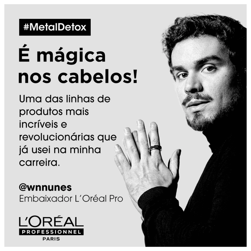 Técnico: após lavar com o shampoo Metal Detox, aplique de 2 a 3 pumps. Pause de 3 a 5 minutos. enxágue em seguida