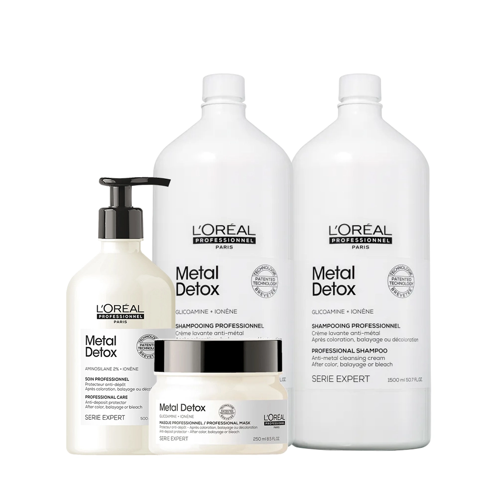 Este Kit Contém L'Oréal Professionnel Metal Detox - Shampoo 1,5L (2 unidades): possui tecnologia neutralizadora, para limpar e desintoxicar os fios. Evita que novas partículas de metal voltem, após serviços de cor, como mechas ou descoloração. L'Oréal Professionnel Metal Detox - Máscara Capilar 250ml: esse tratamento traz cosmeticidade aos fios, selando as cutículas e protege a fibra de depósitos de partículas após qualquer serviço de cor, mechas ou descoloração. L'Oréal Professionnel Metal Detox Soin - Produto Técnico 500ml: protetor para cabelos coloridos. Soin mantém a cor protegida e vibrante com uma ação anti-depósito. Protege a fibra capilar de depósitos de partículas de metal após a coloração, mechas ou serviço de descoloração. Dessa forma, impede a ação dos metais, garantindo mais força, resistência e brilho aos fios e mantendo a cor radiante e duradoura. Conselho de Aplicação Kit L'Oréal Professionnel Metal Detox Shampoo Extra Litro Máscara e Produto Técnico (4 produtos)