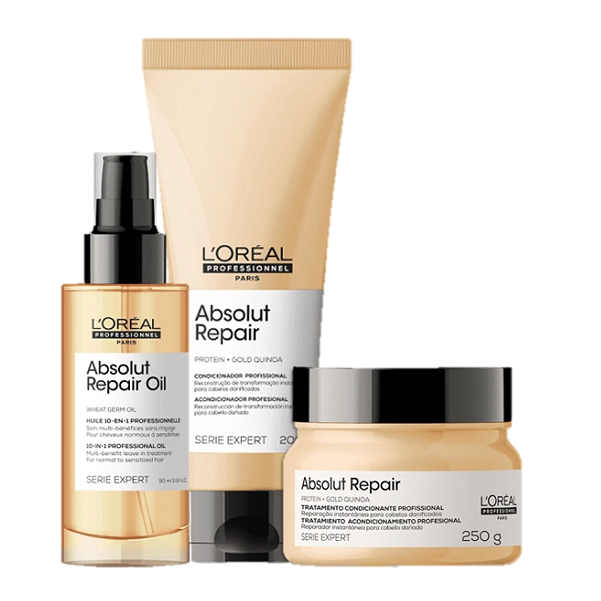 LOreal Professionnel Kit Serie Expert Absolut Repair Gold Quinoa Protein Condicionador 200ml Mascara 250ml e Oleo 90ml Condicionador Serie Expert Absolut Repair Gold Quinoa + Protein L'Oréal Professionnel Condicionador para cabelos danificados. L'Oréal Professionnel Serie Expert Absolut Repair Gold Quinoa + Protein Instant Resurfacing Conditioner desembaraça e reestrutura a superfície do fio para mais brilho e leveza. O Condicionador Serie Expert Absolut Repair Gold Quinoa + Protein L'Oréal Professionnel traz ativos que ajudam restaurar a superfície dos fios para que o cabelo revele uma aparência mais saudável. Seu visual ganha muito mais luminosidade e um toque sedoso incrível. Conselho de Aplicação Distribua de maneira uniforme por todo o cabelo lavado e seco com uma toalha. Deixe no cabelo de 2 a 3 minutos e depois enxague completamente. Evite exagerar na quantidade do condicionador, já que isso vai dificultar a remoção do produto e causar desperdício. O que vai gerar resultados satisfatórios é o uso adequado dos ativos, não a quantidade em grandes proporções. Máscara L'Oréal Professionnel Serie Expert Capilar Absolut Repair Gold Quinoa + Protein Máscara de tratamento para cabelos danificados. L'Oréal Professionnel Serie Expert Absolut Repair Gold Quinoa + Protein faz uma restauração completa nos fios para devolver saúde e brilho ao cabelo. A Máscara L'Oréal Professionnel Serie Expert Capilar Absolut Repair Gold Quinoa + Protein atua na reparação da fibra capilar extremamente fragilizada para que o cabelo revele uma aparência mais saudável. Seu visual ganha muito mais brilho e um toque macio incrível. A Máscara Absolut Repair, de L'Oréal, é máscara de reestruturação intensiva definitiva! Conselho de Aplicação Espalhe a máscara L'Oréal no cabelo limpo e úmido, nos comprimentos e pontas. Deixe agir por cerca de 5 minutos e enxágue. Se você acabou de passar por alguma química que danificou bastante os fios, o tratamento precisa ser intensivo. Você pode usar a máscara dia sim dia não durante a primeira semana logo depois da química. Óleo Reparador L'Oréal Professionnel Serie Expert Absolut Repair Gold Quinoa 10in1 Óleo reparador para cabelos finos, ressecados e danificados. L'Oréal Professionnel Serie Expert Absolut Repair Gold Quinoa 10in1 proporciona 10 benefícios para o cabelo, com resultado de fios nutridos, brilhantes e leves, com toque suave. O Óleo Reparador L'Oréal Professionnel Serie Expert Absolut Repair Gold Quinoa 10in1 foi desenvolvido especialmente para cabelos danificados. Seus principais ingredientes, a Quinoa Dourada e Proteína Hidrolisada de Trigo, criam um filme protetor que mantém as cutículas seladas, retendo as propriedades restauradoras dentro da fibra capilar. Promove 10 benefícios: Conselho de Aplicação Super versátil, você também pode usar o produto como pré-shampoo e garantir um tratamento especial para o cabelo.