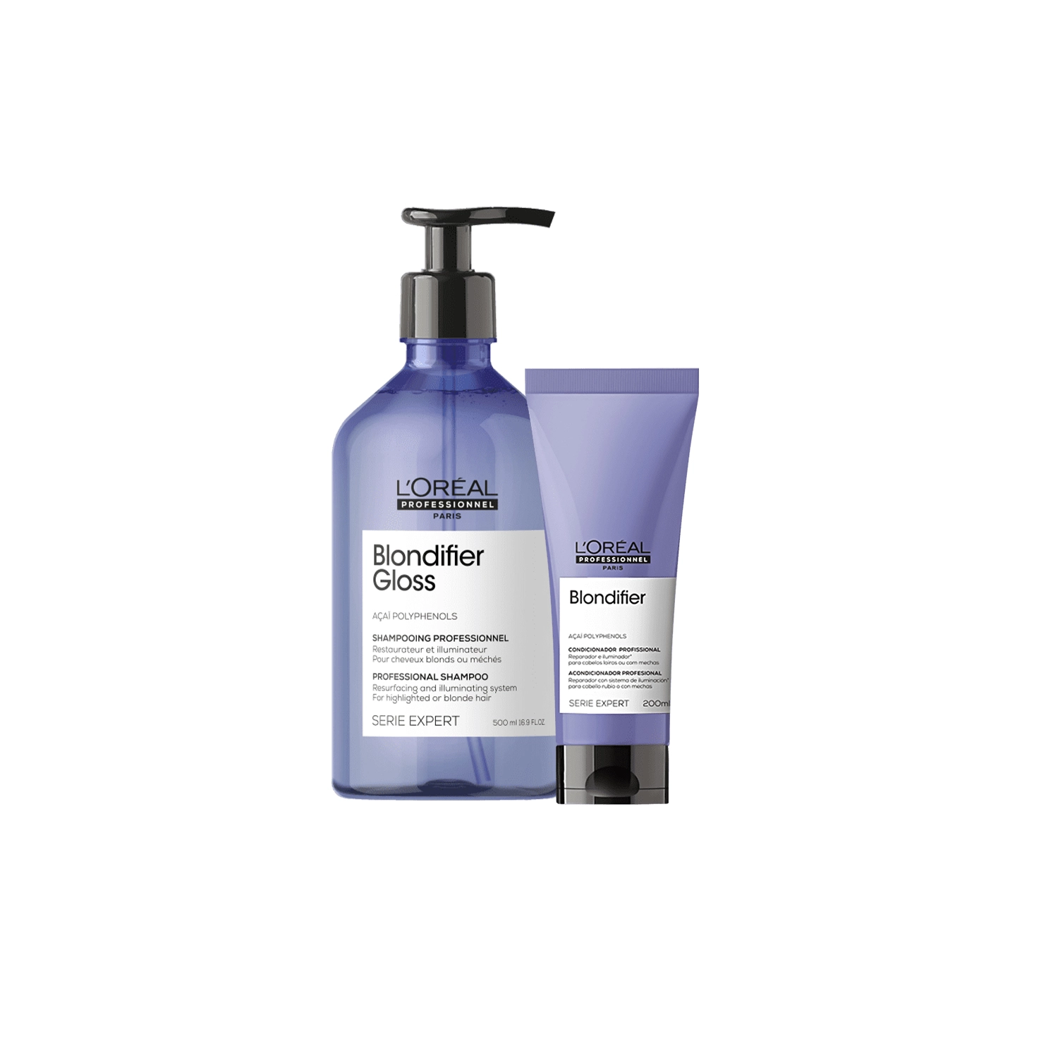 Kit Ideal para cabelos loiros que precisam de um tom mais brilhoso pois suaviza o cabelo danificado. Por conter polifenóis presentes no açaí, proporciona um tratamento intenso e ideal para loiras. Sua fórmula nutre e aumenta o brilho dos cabelos loiros, deixando os fios saudáveis, limpos e tratados. L’Oréal Professionnel Blondifier Gloss - Shampoo 500ml: limpa suavemente, nutre os fios e intensifica o brilho multidimensional do cabelo loiro. Seu principal ingrediente, o Açai Polyphenols, é um importante antioxidante responsável por prevenir a oxidação dos cabelos loiros ou descoloridos, sensíveis às exposições climáticas, poluição e outros fatores externos. Linha desenvolvida especialmente para um tratamento iluminador de loiros ou descoloridos. L’Oréal Professionnel Serie Expert Blondifier - Condicionador 200ml: reacende a cor, traz brilho e muita maciez. Para quem quer ter os fios claros e lindos, sem comprometer a saúde. Repara as agressões diárias causadas aos fios, pela poluição, clima e sol. Também equilibra o pH da fibra para garantir cutículas seladas e eliminar o aspecto ressecado. Shampoo: distribuir uniformemente o shampoo por todo o cabelo molhado e fazer espuma. Enxaguar completamente. Repetir o processo se necessário. Condicionador: nos fios limpos e úmidos, passe uma quantidade suficiente de condicionador no comprimento e pontas, sem aplicar na raiz. Massageie delicadamente as mechas, deixe agir um pouco e, depois, enxágue.Kit L’Oréal Professionnel Serie Expert Blondifier Gloss Home Care (2 produtos)
