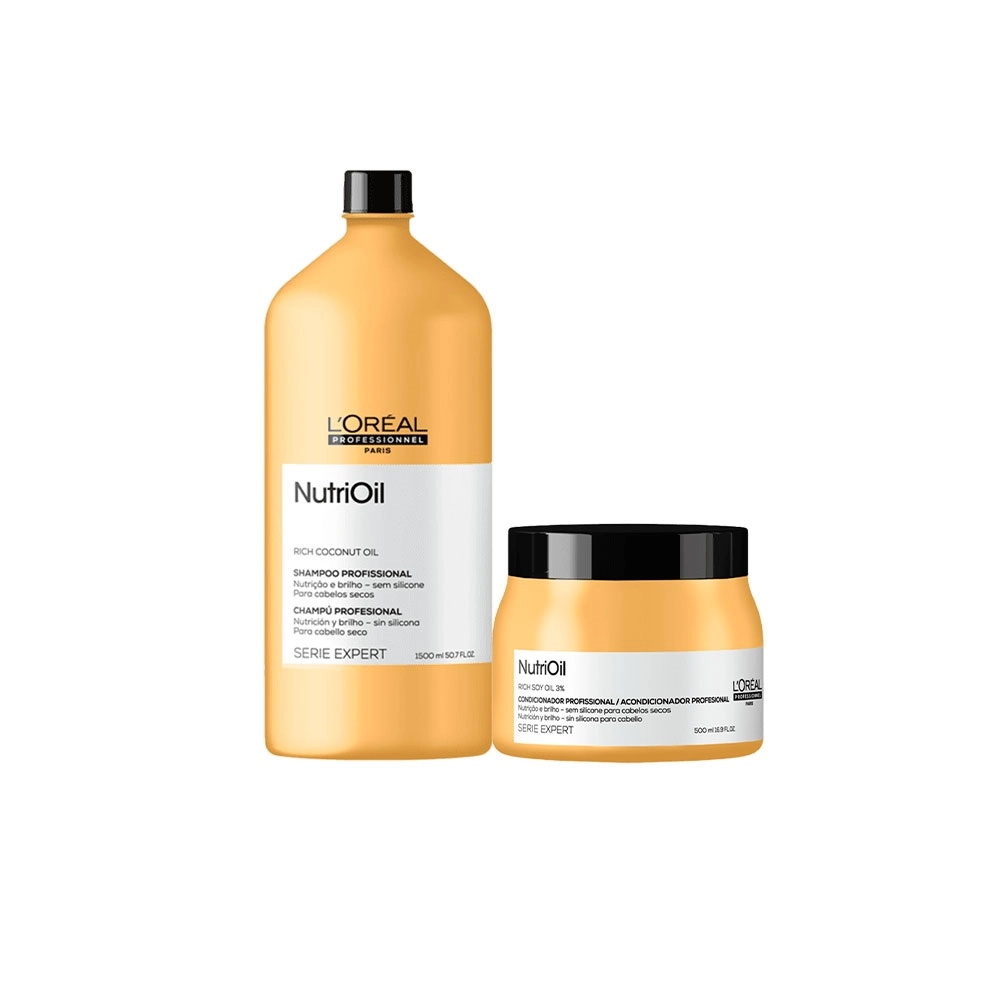L'Oréal Professionnel Serie Expert NutriOil possui textura leve que promove a dose certa de nutrição sem pesar os fios. Este Kit Contém L'Oréal Professionnel Serie Expert NutriOil - Shampoo 1,5L: shampoo para cabelos ressecados. O Shampoo L'Oréal Professionnel Serie Expert NutriOil garante cabelos 4x mais nutridos e brilhantes. Sua fórmula é enriquecida com óleo de coco que hidrata e nutre os fios profundamente, promovendo maciez e saúde. L'Oréal Professionnel Serie Expert NutriOil - Máscara de Tratamento 500ml: hidratação para os cabelos sem pesar os fios. Conselho de Aplicação Shampoo: aplique o shampoo diretamente sobre o cabelo molhado. Massageie suavemente até surgir espuma e, depois, enxague com bastante água. Máscara: depois de lavar, remova o excesso de água. Pegue uma quantidade suficiente de máscara e espalhe uniformemente pela extensão dos fios. Deixe agir por 3 a 5 minutos e enxague completamente.Kit L'Oréal Professionnel Serie Expert NutriOil Shampoo 1,5L + Máscara 500ml (2 produtos)