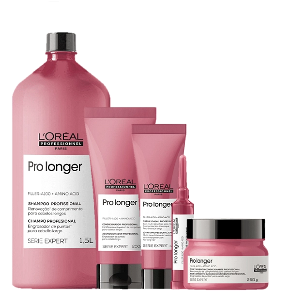 LOreal Professionnel Serie Expert Pro Longer Shampoo 1500ml Condicionador 200ml Leave-in 150ml e Ampola 15ml Shampoo L'Oréal Professionnel Serie Expert Pro Longer Shampoo para cabelos longos com pontas afinadas ou danificadas. Shampoo L'Oréal Professionnel Serie Expert Pro Longer ajuda a renovar a aparência da fibra instantaneamente, devolvendo densidade às pontas. Shampoo L'Oréal Professionnel Serie Expert Pro Longer apresenta uma fórmula exclusiva que deixa o cabelo mais forte, macio e com 5x mais brilho. Traz a tecnologia da Co-Emulsão, que conta com moléculas 50 vezes menores do que as tradicionais, que penetra profundamente na fibra e forma um filme protetor, aperfeiçoando a superfície do cabelo. Deixa os cabelos com toque leve e suave. Conselho de Aplicação Aplique o shampoo sobre os fios molhados. Massageie com as pontas dos dedos suavemente até formar espuma. Em seguida enxágue. Repita a aplicação. Continue o tratamento com os produtos da mesma linha para conquistar um cabelo longo, denso e com brilho. Condicionador L'Oréal Professionnel Serie Expert Pro Longer Condicionador para cabelos longos com pontas afinadas ou danificadas. L'Oréal Professionnel Serie Expert Pro Longer devolve densidade às pontas dos fios. O Condicionador L'Oréal Professionnel Serie Expert Pro Longer proporciona uma redução de 34% das pontas duplas. Com fórmula exclusiva, o condicionador Pro Longer garante melhor resultado em pontas finas ou em áreas onde o preenchimento é mais necessário. Conselho de Aplicação Com os cabelos lavados e úmidos, aplique o condicionador Pro Longer no comprimento e nas pontas e massageie bem as mechas para distribuir o produto uniformemente. Deixe agir por 2 a 3 minutos, emulsione e enxágue bem. Não recomendado o uso na raiz dos cabelos. Nossos Experts Ensinam Dica de tratamento: o condicionador pode ser usado após a máscara de tratamento para selar as cutículas do cabelo Leave-in L'Oréal Professionnel Serie Expert Pro Longer Leave-in para cabelos longos com pontas danificadas ou afinadas. Leave-in L'Oréal Professionnel Serie Expert Pro Longer oferece proteção térmica até 230ºC, 56% menos danos na superfície, controle do frizz e efeito antipoluição. Leave-in L'Oréal Professionnel Serie Expert Pro Longer possui fórmula enriquecida com Filler-A100 e Aminoácidos, que ajudam a renovar instantaneamente a fibra do cabelo por dentro e pela superfície. Recomendado o uso antes de ferramentas de calor como secador, chapinha e modelador de cachos. Conselho de Aplicação Aplique no comprimento e pontas, com os fios úmidos ou secos. Finalize como desejar. Nossos Experts Ensinam O protetor térmico cria uma barreira, além de proteger do calor, e facilita a secagem, dando durabilidade ao look e criando um filme sobre o cabelo. Máscara L'Oréal Professionnel Serie Expert Pro Longer Máscara de tratamento para cabelos longos com pontas afinadas ou danificadas. L'Oréal Professionnel Serie Expert Pro Longer hidrata e devolve densidade aos fios. Com ação renovadora, a Máscara L'Oréal Professionnel Serie Expert Pro Longer confere uma redução de até 66% das pontas duplas, graças a sua fórmula que contém ativos poderosos e inovadores. O resultado que a máscara L'Oréal Pro Longer entrega é um cabelo longo mais forte, denso, com brilho e preenchimento de pontas danificadas e afinadas. Nossos Experts Ensinam