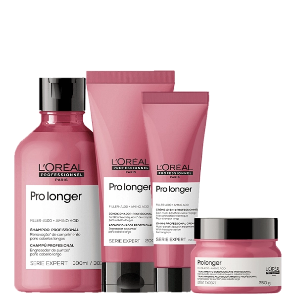 LOreal Professionnel Serie Expert Pro Longer Duo Home Care Leave in 150ml e Mascara 250g Shampoo L'Oréal Professionnel Serie Expert Pro Longer Shampoo para cabelos longos com pontas afinadas ou danificadas. Shampoo L'Oréal Professionnel Serie Expert Pro Longer ajuda a renovar a aparência da fibra instantaneamente, devolvendo densidade às pontas. Shampoo L'Oréal Professionnel Serie Expert Pro Longer apresenta uma fórmula exclusiva que deixa o cabelo mais forte, macio e com 5x mais brilho. Traz a tecnologia da Co-Emulsão, que conta com moléculas 50 vezes menores do que as tradicionais, que penetra profundamente na fibra e forma um filme protetor, aperfeiçoando a superfície do cabelo. Deixa os cabelos com toque leve e suave. Conselho de Aplicação Aplique o shampoo sobre os fios molhados. Massageie com as pontas dos dedos suavemente até formar espuma. Em seguida enxágue. Repita a aplicação. Continue o tratamento com os produtos da mesma linha para conquistar um cabelo longo, denso e com brilho. Condicionador L'Oréal Professionnel Serie Expert Pro Longer Condicionador para cabelos longos com pontas afinadas ou danificadas. L'Oréal Professionnel Serie Expert Pro Longer devolve densidade às pontas dos fios. O Condicionador L'Oréal Professionnel Serie Expert Pro Longer proporciona uma redução de 34% das pontas duplas. Com fórmula exclusiva, o condicionador Pro Longer garante melhor resultado em pontas finas ou em áreas onde o preenchimento é mais necessário. Conselho de Aplicação Com os cabelos lavados e úmidos, aplique o condicionador Pro Longer no comprimento e nas pontas e massageie bem as mechas para distribuir o produto uniformemente. Deixe agir por 2 a 3 minutos, emulsione e enxágue bem. Não recomendado o uso na raiz dos cabelos. Nossos Experts Ensinam Dica de tratamento: o condicionador pode ser usado após a máscara de tratamento para selar as cutículas do cabelo. Leave-in L'Oréal Professionnel Serie Expert Pro Longer Leave-in para cabelos longos com pontas danificadas ou afinadas. Leave-in L'Oréal Professionnel Serie Expert Pro Longer oferece proteção térmica até 230ºC, 56% menos danos na superfície, controle do frizz e efeito antipoluição. Leave-in L'Oréal Professionnel Serie Expert Pro Longer possui fórmula enriquecida com Filler-A100 e Aminoácidos, que ajudam a renovar instantaneamente a fibra do cabelo por dentro e pela superfície. Recomendado o uso antes de ferramentas de calor como secador, chapinha e modelador de cachos. Conselho de Aplicação Aplique no comprimento e pontas, com os fios úmidos ou secos. Finalize como desejar. Nossos Experts Ensinam O protetor térmico cria uma barreira, além de proteger do calor, e facilita a secagem, dando durabilidade ao look e criando um filme sobre o cabelo. Máscara L'Oréal Professionnel Serie Expert Pro Longer Máscara de tratamento para cabelos longos com pontas afinadas ou danificadas. L'Oréal Professionnel Serie Expert Pro Longer hidrata e devolve densidade aos fios. Com ação renovadora, a Máscara L'Oréal Professionnel Serie Expert Pro Longer confere uma redução de até 66% das pontas duplas, graças a sua fórmula que contém ativos poderosos e inovadores. O resultado que a máscara L'Oréal Pro Longer entrega é um cabelo longo mais forte, denso, com brilho e preenchimento de pontas danificadas e afinadas. Nossos Experts Ensinam