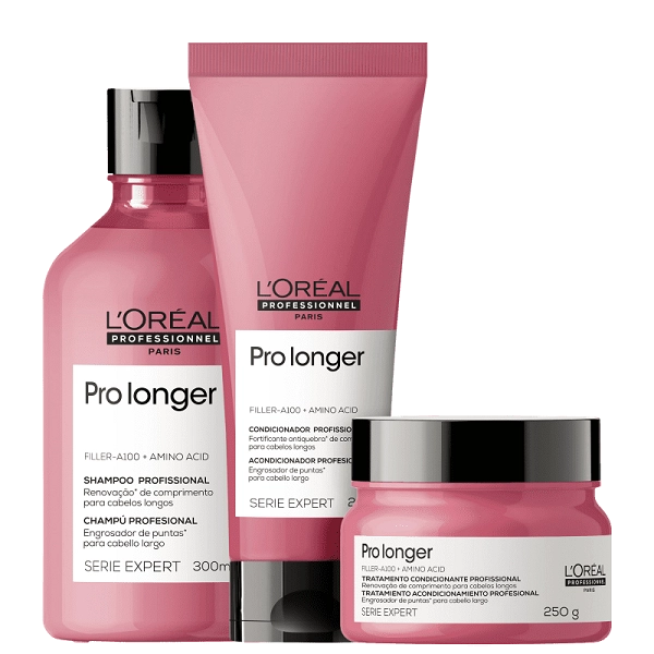 LOreal Professionnel Serie Expert Pro Longer Duo Home Care e Mascara 250g Shampoo L'Oréal Professionnel Serie Expert Pro Longer Shampoo para cabelos longos com pontas afinadas ou danificadas. Shampoo L'Oréal Professionnel Serie Expert Pro Longer ajuda a renovar a aparência da fibra instantaneamente, devolvendo densidade às pontas. Shampoo L'Oréal Professionnel Serie Expert Pro Longer apresenta uma fórmula exclusiva que deixa o cabelo mais forte, macio e com 5x mais brilho. Traz a tecnologia da Co-Emulsão, que conta com moléculas 50 vezes menores do que as tradicionais, que penetra profundamente na fibra e forma um filme protetor, aperfeiçoando a superfície do cabelo. Deixa os cabelos com toque leve e suave. Conselho de Aplicação Aplique o shampoo sobre os fios molhados. Massageie com as pontas dos dedos suavemente até formar espuma. Em seguida enxágue. Repita a aplicação. Continue o tratamento com os produtos da mesma linha para conquistar um cabelo longo, denso e com brilho. Condicionador L'Oréal Professionnel Serie Expert Pro Longer Condicionador para cabelos longos com pontas afinadas ou danificadas. L'Oréal Professionnel Serie Expert Pro Longer devolve densidade às pontas dos fios. O Condicionador L'Oréal Professionnel Serie Expert Pro Longer proporciona uma redução de 34% das pontas duplas. Com fórmula exclusiva, o condicionador Pro Longer garante melhor resultado em pontas finas ou em áreas onde o preenchimento é mais necessário. Conselho de Aplicação Com os cabelos lavados e úmidos, aplique o condicionador Pro Longer no comprimento e nas pontas e massageie bem as mechas para distribuir o produto uniformemente. Deixe agir por 2 a 3 minutos, emulsione e enxágue bem. Não recomendado o uso na raiz dos cabelos. Nossos Experts Ensinam Dica de tratamento: o condicionador pode ser usado após a máscara de tratamento para selar as cutículas do cabelo. Máscara L'Oréal Professionnel Serie Expert Pro Longer Máscara de tratamento para cabelos longos com pontas afinadas ou danificadas. L'Oréal Professionnel Serie Expert Pro Longer hidrata e devolve densidade aos fios. Com ação renovadora, a Máscara L'Oréal Professionnel Serie Expert Pro Longer confere uma redução de até 66% das pontas duplas, graças a sua fórmula que contém ativos poderosos e inovadores. O resultado que a máscara L'Oréal Pro Longer entrega é um cabelo longo mais forte, denso, com brilho e preenchimento de pontas danificadas e afinadas. Nossos Experts Ensinam