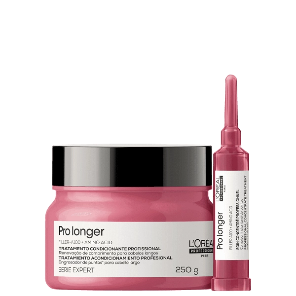 Máscara L'Oréal Professionnel Serie Expert Pro Longer Máscara de tratamento para cabelos longos com pontas afinadas ou danificadas. L'Oréal Professionnel Serie Expert Pro Longer hidrata e devolve densidade aos fios. Com ação renovadora, a Máscara L'Oréal Professionnel Serie Expert Pro Longer confere uma redução de até 66% das pontas duplas, graças a sua fórmula que contém ativos poderosos e inovadores. O resultado que a máscara L'Oréal Pro Longer entrega é um cabelo longo mais forte, denso, com brilho e preenchimento de pontas danificadas e afinadas. Aplique sua L'Oréal Pro Longer, concentrando a máscara no cabelo lavado e úmido, após utilização do shampoo. Deixar agir por 3 a 5 minutos. Enxágue bem. Dica de tratamento: o Condicionador L'Oréal Professionnel Serie Expert Pro Longer pode ser usado após a máscara de tratamento para selar as cutículas do cabelo. Ampola Pro Longer L'Oréal Professionnel Serie Expert Ampola de tratamento para cabelos longos com pontas afinadas ou danificadas. L'Oréal Pro Longer Serie Expert preenche instantaneamente a fibra capilar das pontas. Ampola Pro Longer L'Oréal Professionnel Serie Expert conta com alta concentração de Filler-A100 e Aminoácidos para densificar as pontas com resultado imediato e de maneira duradoura. Os Aminoácidos da fórmula da Ampola Pro Longer penetram na fibra, preenchendo o seu interior enquanto o Filler-A100 preenche a parte superior da fibra, deixando as pontas preenchidas e mais fortes. Após o uso, há uma redução de 20% das pontas duplas. Conselho de Aplicação Para conquistar o efeito desejado sempre siga as orientações do rótulo do produto. Para um melhor resultado, utilize a linha completa de L'Oréal Professionnel Serie Expert Pro Longer. Isso garantirá um cabelo mais longo, denso e com brilho.LOreal Professionnel Serie Expert Pro Longer Mascara Capilar 250g e Ampola 15ml