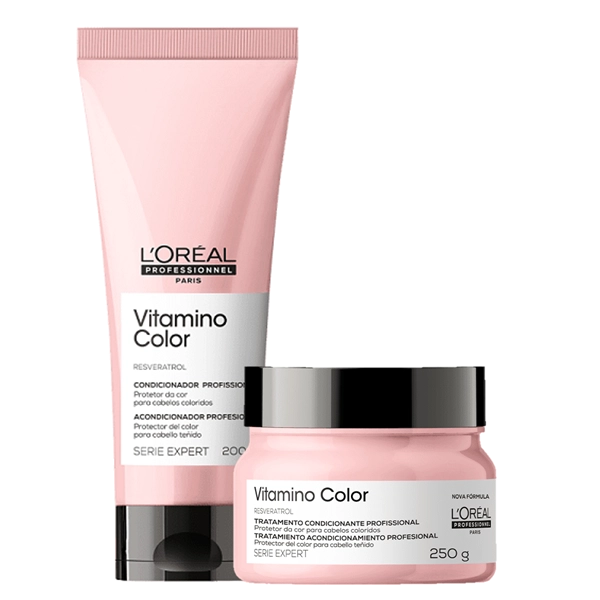 Condicionador para cabelos coloridos. L'Oréal Professionnel Serie Expert Vitamino Color promove proteção da cor, hidratação e luminosidade para os fios. O Condicionador L'Oréal Professionnel Serie Expert Vitamino Color traz como principal ingrediente, o resveratrol, um poderoso antioxidante presente na casca e nas sementes das uvas, que tem a função de preservar a cor dos cabelos. O resultado é um cabelo com 8 semanas de proteção da cor e 7x mais brilho. Conselho de Aplicação Aplique no cabelo lavado e úmido. Passe no comprimento e pontas. Deixe agir por alguns instantes. Enxágue bem. Retire o excesso de água do fio com uma toalha depois de lavar o cabelo para que o condicionador possa agir melhor. Máscara para cabelos coloridos. L'Oréal Professionnel Serie Expert Vitamino Color proporciona hidratação, proteção da cor e devolve a maciez e brilho intenso aos fios. A Máscara L'Oréal Professionnel Serie Expert Vitamino Color promove proteção até das cores mais sensíveis, hidratação e luminosidade para os fios. Seu principal ingrediente, o Resveratrol, é um poderoso antioxidante presente na casca e nas sementes das uvas, que tem a função de preservar a cor dos cabelos por mais tempo. O resultado é um cabelo com 8 semanas de proteção da cor e 7x mais brilho. Conselho de Aplicação Após lavar o cabelo com shampoo, se achar necessário, aplique o condicionador. E então, aplique a máscara pelo comprimento e pontas. Deixe agir no cabelo por 3-5 minutos. Em seguida, enxágue completamente. Para potencializar a ação, massageie mecha a mecha, deslizando as mãos no sentido do crescimento do cabelo, com o movimento de enluvá-lo. Espalhe bem. Deixe agir pelo tempo indicado. O Kit contém L'Oréal Professionnel Serie Expert Vitamino Color Condicionador 200ml L'Oréal Professionnel Serie Expert Vitamino Color Máscara Capilar 250g
