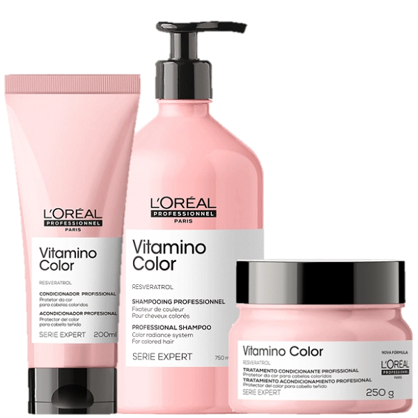 LOreal Professionnel Kit Serie Expert Vitamino Color Trio 3 Produtos Kit com shampoo e condicionador para cabelos coloridos. Kit L’Oréal Professionnel Serie Expert Vitamino Color Duo mantém a vitalidade da cor por mais tempo. O Kit L’Oréal Professionnel Serie Expert Vitamino Color Duo traz shampoo e condicionador formulados com Resveratrol e agentes antioxidantes, para proteção da cor e brilho intenso, evitando o desbotamento e garantindo um resultado de cor radiante e duradoura. Conselho de Aplicação Aplique o shampoo no cabelo molhado. Passe uma pequena quantidade no couro cabeludo. Massageie com a ponta dos dedos até surgir espuma e depois enxágue. Repita se sentir necessidade. Após o shampoo, aplique o condicionador no comprimento e pontas. Deixe agir por alguns instantes. Enxágue bem. Nossos Experts Ensinam Faça sempre duas lavagens com o shampoo. A primeira irá retirar todas as impurezas mais pesadas, enquanto a segunda finaliza a higienização do couro cabeludo e inicia o tratamento. Máscara L'Oréal Professionnel Serie Expert Vitamino Color Máscara para cabelos coloridos. L'Oréal Professionnel Serie Expert Vitamino Color proporciona hidratação, proteção da cor e devolve a maciez e brilho intenso aos fios. A Máscara L'Oréal Professionnel Serie Expert Vitamino Color promove proteção até das cores mais sensíveis, hidratação e luminosidade para os fios. Seu principal ingrediente, o Resveratrol, é um poderoso antioxidante presente na casca e nas sementes das uvas, que tem a função de preservar a cor dos cabelos por mais tempo. O resultado é um cabelo com 8 semanas de proteção da cor e 7x mais brilho. Conselho de Aplicação Após lavar o cabelo com shampoo, se achar necessário, aplique o condicionador. E então, aplique a máscara pelo comprimento e pontas. Deixe agir no cabelo por 3-5 minutos. Em seguida, enxágue completamente. Para potencializar a ação, massageie mecha a mecha, deslizando as mãos no sentido do crescimento do cabelo, com o movimento de enluvá-lo. Espalhe bem. Deixe agir pelo tempo indic