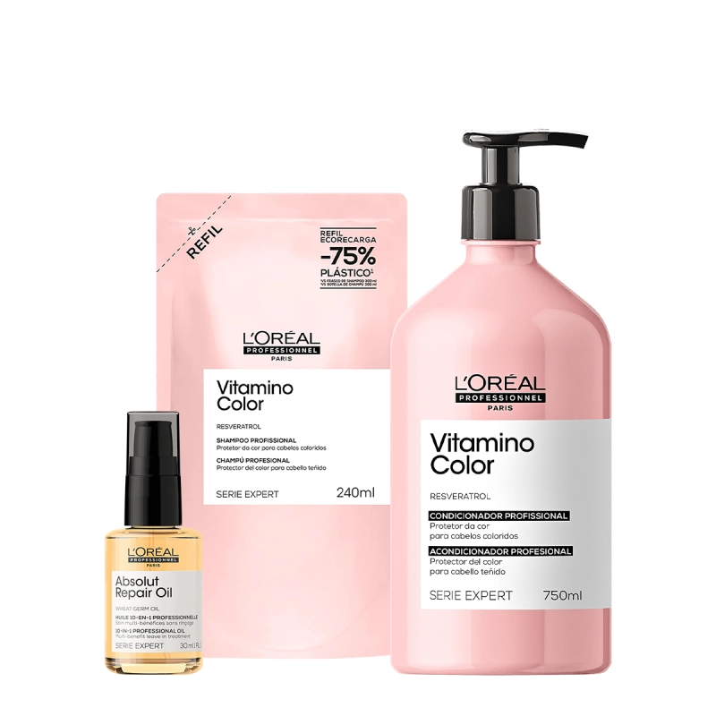 L'Oréal Professionnel Serie Expert Vitamino Color Resveratrol Refil - Shampoo 240ml: limpa suavemente enquanto protege a cor e fortalece a fibra capilar, deixando os fios leves e luminosos. L'Oréal Professionnel Serie Expert Vitamino Color Condicionador 750ml: preserva a cor por até 8 semanas e proporciona 7x mais brilho, garantindo maciez e vitalidade duradoura. L'Oréal Professionnel Serie Expert Absolut Repair Gold Quinoa - Óleo Reparador 30ml: nutre intensamente, controla o frizz, protege contra o calor e confere um brilho radiante sem pesar, deixando os cabelos disciplinados e sedosos.L'Oréal Professionnel Vitamino Color - Proteção da Cor, Nutrição Profunda e Brilho Intenso para os Fios