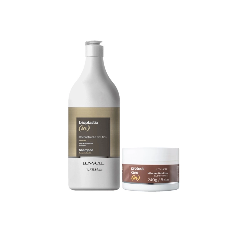 Este Kit Contém Lowell Bioplastia (in) - Shampoo 1L: para cabelos danificados, realiza uma limpeza eficaz, confere força e suavidade aos fios. Conta com a tecnologia Amino Care, que ajuda a recuperar os danos da fibra capilar e preparar as madeixas para a reconstrução. Lowell Protect Carer (in) - Máscara Nutritiva 240g: repõe óleos e vitaminas essenciais para dar maciez, toque acetinado e mais saúde para o cabelo. Oferece nutrição profunda e imediata, combate o frizz, porosidade e confere brilho aos fios. Conselho de Aplicação Shampoo: com o cabelo molhado, aplique o shampoo e massageie. Enxague e repita a aplicação. Após retirar a umidade excessiva, aplique o condicionador ou a máscara capilar. Máscara: com os fios limpos e úmidos, aplique a máscara pelo comprimento e pontas. Espalhe massageando mecha a mecha. Deixe agir por 5 minutos, e então, enxague completamente. Kit Lowell Bioplastia (in) Protect Care (2 produtos)