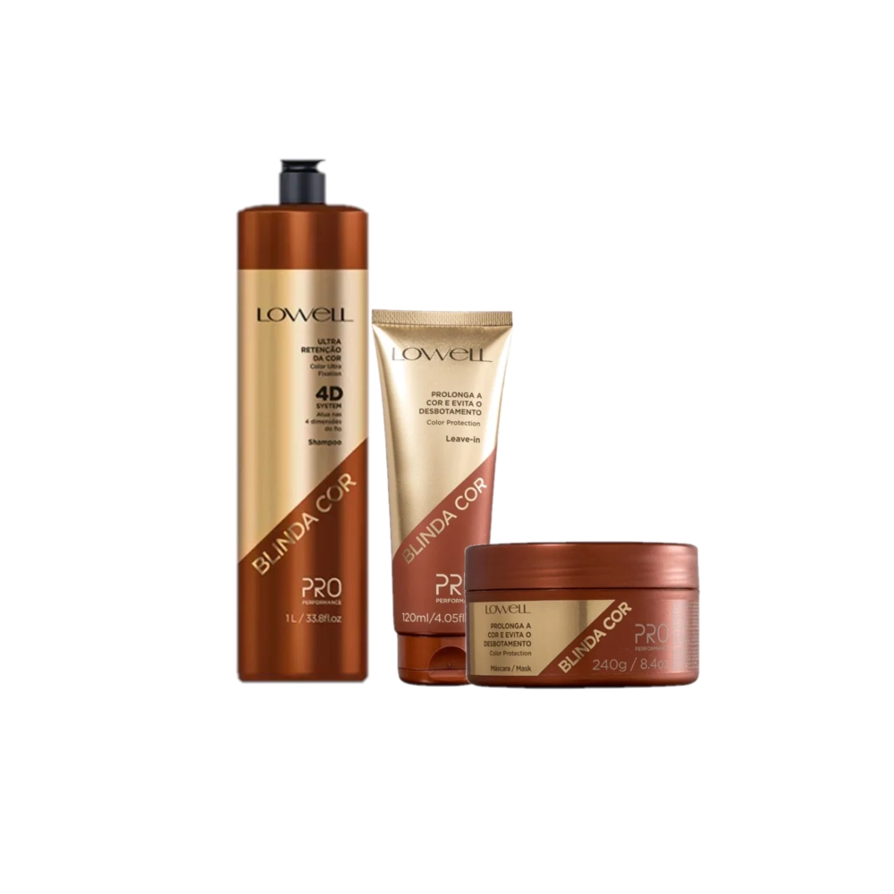 Este Kit Contém Lowell Blinda Cor Pro Performance - Shampoo 1L: shampoo para cabelos coloridos e descoloridos, protege e aumenta a durabilidade da cor enquanto garante brilho intenso. Garante um bloqueio da perda de pigmentos e proporciona luminosidade aos fios. Sua fórmula conta com filtro solar e tecnologia 4D System, que atua nas 4 dimensões dos fios (Córtex, Medula, Cutícula e Superfície) e evita o desbotamento e vivacidade da coloração. Tudo isso no momento da lavagem. Conselho de Aplicação Shampoo: aplique o shampoo no cabelo molhado e massageie o couro cabeludo e os fios suavemente. Enxague e, se for necessário, repita a lavagem.Kit Lowell Blinda Cor Pro Performance Finalização Hidratante (3 produtos)