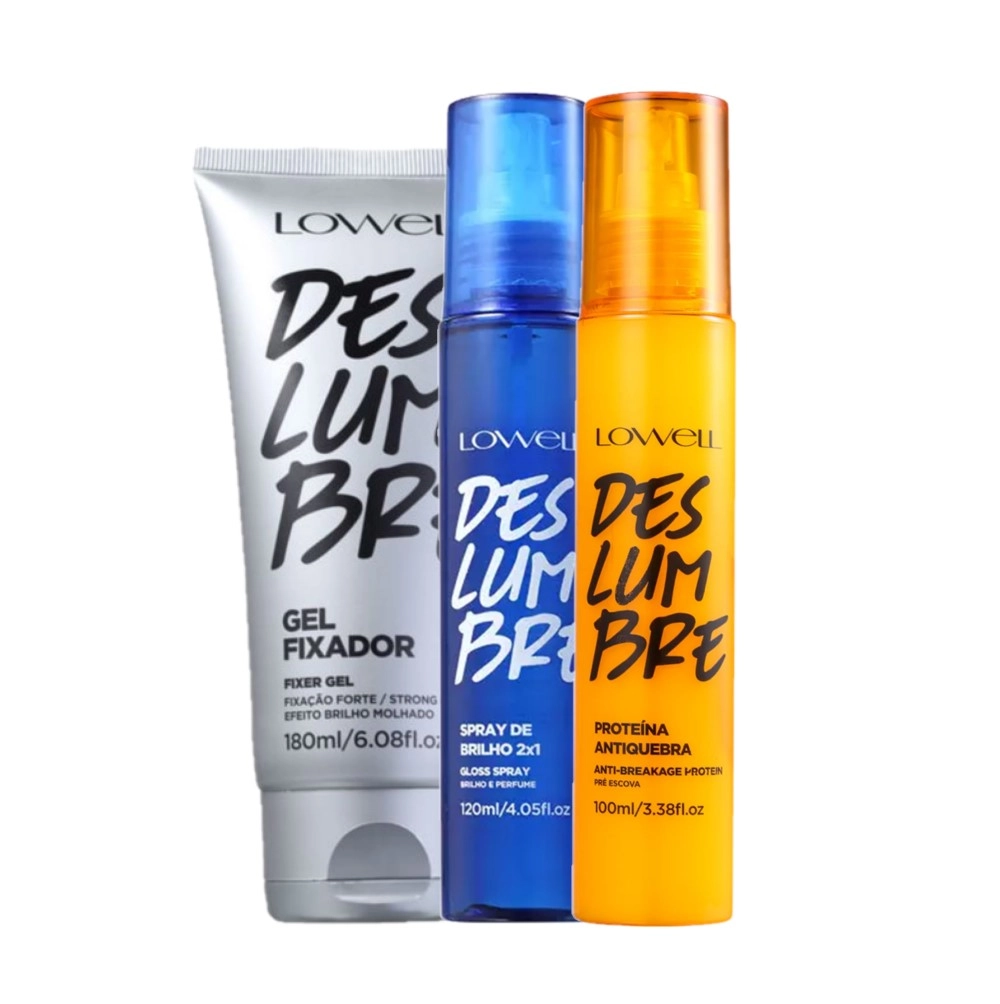 Spray protetor térmico para todos os tipos de cabelo. Lowell Deslumbre Proteína Anti-Quebra combate o frizz, facilita o desembaraçar e protege dos danos causados pelos acessórios térmicos. Assim, é ideal para usar antes da escovação. Spray de brilho. Lowell Deslumbre Spray de Brilho 2x1 proporciona luminosidade enquanto neutraliza odores desagradáveis e deixa um perfume suave. Contém: Lowell Deslumbre - Gel Fixador 180ml: garante fixação forte ao penteado e brilho intenso na finalização. Lowell Deslumbre - Proteína Anti-Quebra 100ml: permite com que seu cabelo seja escovado sem nenhum quebra. Possui efeito antiestético, que deixa o fio alinhado e disciplinado. Sua fórmula não pesa e não acumula no cabelo, além de proteger dos efeitos nocivos da poluição. Lowell Deslumbre Spray de Brilho 2x1 120ml: oferece uma finalização perfeita do penteado. Com ele, seu visual ganha um brilho incrível e fica protegido dos maus odores causados pela poluição, cigarros, entre outros. Modo de usar Gel Fixador: Aplique a quantidade desejada do gel nas mãos e espalhe sobre o cabelo úmido ou seco. Modele como desejar. Spray Anti-Quebra: Borrife diretamente no cabelo úmido e prossiga com a escovação. Spray de Brilho: Borrife o spray no cabelo seco a 15 cm de distância. Seu cabelo fica com um brilho intenso e levemente perfumado.Kit Lowell Deslumbre Brilho Fixador Anti-Quebra (3 produtos)