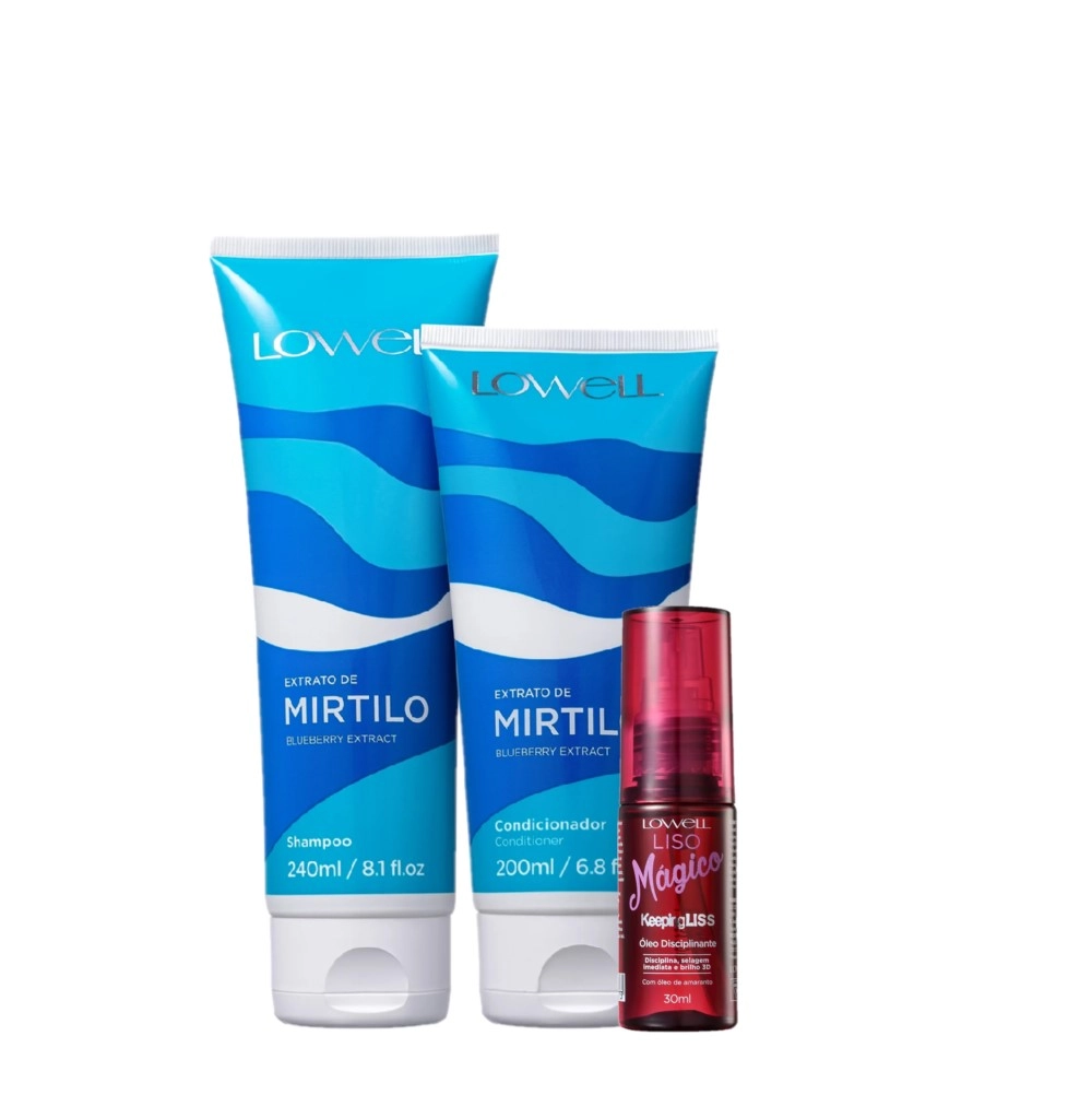 Condicionador Lowell Extrato de Mirtilo combate os danos causados pelos radicais livres, além de dar brilho e aumentar a elasticidade dos fios. Lowell Liso Mágico Keeping Liss forma um filme sobre os fios que mantém o cabelo comportado e longe dos arrepiados, além de ser rico em antioxidantes que protegem a cor do desbotamento e a perda de nutrientes pela fibra capilar. Contém: Lowell Extrato de Mirtilo - Shampoo 240ml: possui fórmula biotecnológica que hidrata e garante maciez ao cabelo enquanto higieniza e combate a oleosidade excessiva, sem ressecar. Também conta com ação prebiótica, que é essencial para a prevenção da caspa. Lowell Extrato de Mirtilo - Condicionador 200ml: Condicionador para todos os tipos de cabelo. Formulado com óleos e manteigas, deixa os fios macios e hidratados. O Liso Mágico Keeping Liss 30ml: protege os fios do frizz com a selagem das cutículas e brilho 3D. Modo de uso Condicionador: Aplique o condicionador sobre o cabelo limpo e úmido, mecha a mecha. Evite passar na raiz. Em seguida, enxágue bem. Oleo: Aplique algumas gotinhas do óleo na palma das mãos e distribua uniformemente pelo comprimento e pontas do cabelo úmido ou após a escovação e prancha.Kit Lowell Extrato de Mirtilo Home Care Magico (3 Produtos)