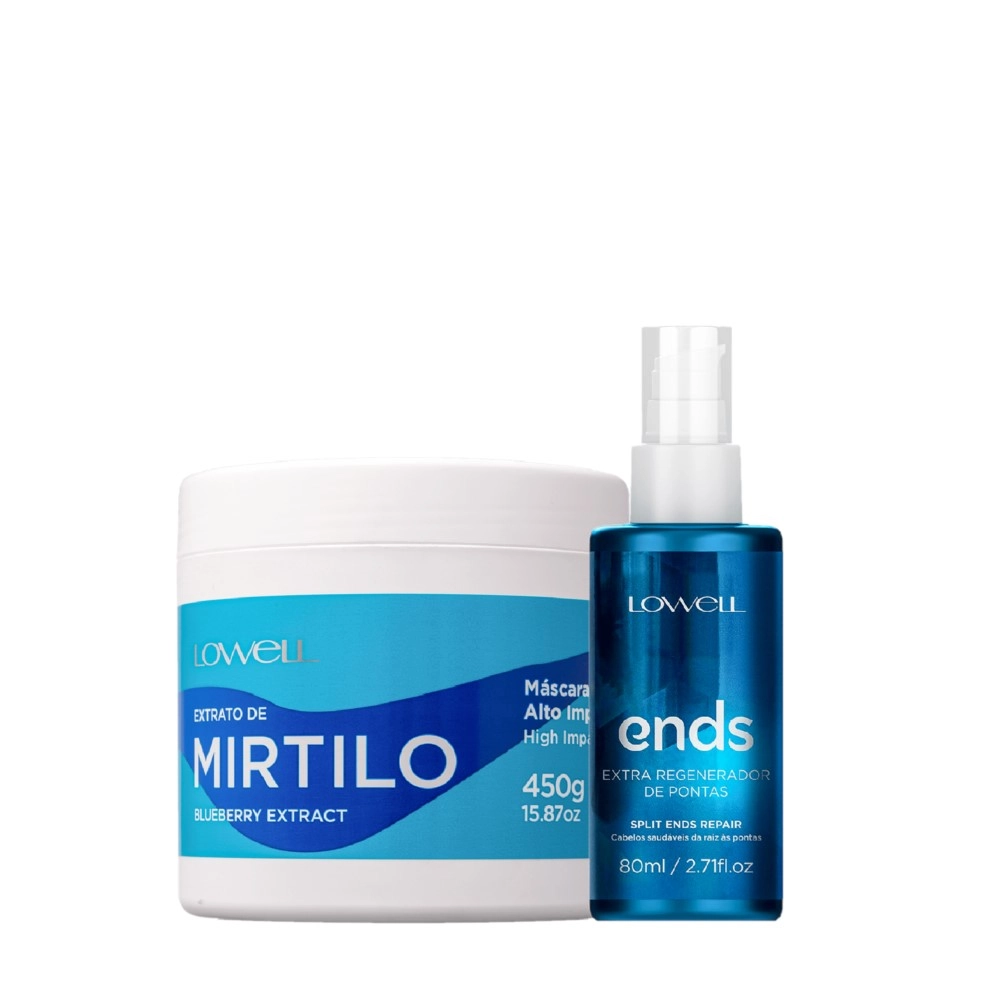 Lowell Ends Extra Regenerador apresenta textura fluída, que não pesa e uma deliciosa fragrância exclusiva, para manter seu cabelo sempre bonito, saudável e com aroma incrível. Contém: Lowell Extrato de Mirtilo Alto Impacto - Máscara Capilar 450g: trata e resgata a aparência saudável do cabelo. Lowell Ends Extra Regenerador de Pontas 100ml: garante recuperação imediata da fibra capilar e promove brilho intenso de modo imediato. Leave-in para todos os tipos de cabelo. Mascara MIRTILO: Com o cabelo limpo e úmido, aplique a máscara do comprimento às pontas. Deixe agir por 3 minutos e enxágue bem. Leave-in: Após lavar e condicionar o cabelo, aplique uma quantidade do leave-in nas mãos e distribua nos fios. Não enxágue e finalize como desejar. Kit Lowell Extrato de Mirtilo Tratamento Regenerador (2 Produtos)