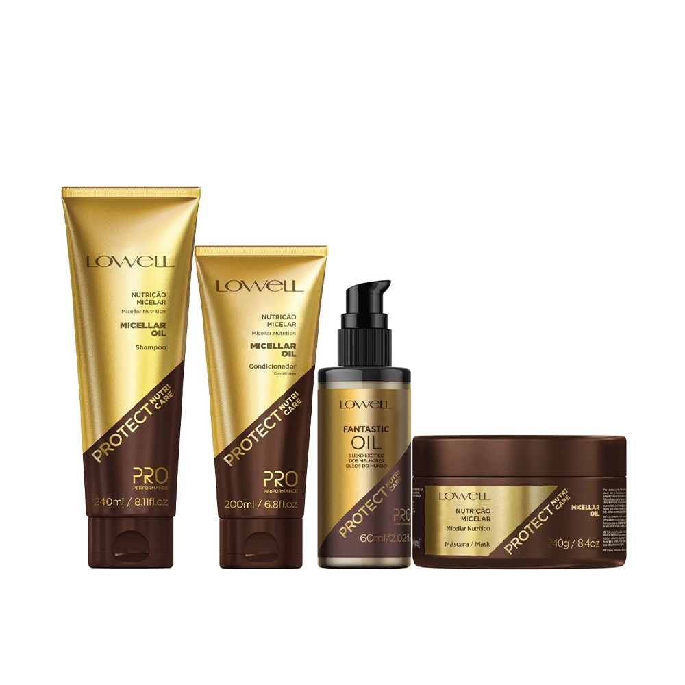 Kit Lowell Pro Protect Nutri Care Home Total (4 produtos) Este Kit Contém Lowell Pro Protect Nutri Care - Shampoo 250ml: desenvolvido para a nutrição profunda dos fios e no combate do ressecamento através da combinação perfeita de nutrição e leveza. Ideal para cabelos ressecados e porosos, os polímeros texturizadores restauram a maciez e eliminam a aspereza sem pesar nos fios. Com tecnologia Micellar Oil, as micelas conduzem os óleos para reposição de nutrientes essenciais para um cabelo saudável. Lowell Pro Protect Nutri Care - Condicionador 200ml: ideal para manter o tratamento de nutrição realizado no salão, o condicionador nutre os fios ressecados ao mesmo tempo que combate a porosidade e o frizz. Lowell Pro Protect Nutri Care - Máscara 240g: com tecnologia Micellar Oil, oferece tratamento intensivo por meio de micelas condutoras que promovem nutrição mais profunda e por muito mais tempo aos fios. Passo 2 do tratamento de nutrição. Através da tecnologia Micellar Oil, os nutrientes são conduzidos para o interior da fibra e liberados de maneira seletiva ao fio oferecendo ação prolongada de nutrição. Sem pesar, elimina a porosidade e promove selagem imediata, além de brilho e toque extra macio aos fios. Lowell Pro Protect Nutri Care - Fantastic Oil 60ml: responsável por repor a camada lipídica natural do fio‚ enriquecido com os melhores óleos do mundo. Um concentrado que oferece alta performance na reposição dos nutrientes vitais para a fibra capilar. Extra nutrição, emoliência, máxima suavidade e brilho extremo garantidos. Sugestão de Aplicação Shampoo: aplique no cabelo molhado massageando-o por completo e com suavidade. Enxágue e repita a operação. Condicionador: após lavar o cabelo com o shampoo, aplique o condicionador e enxágue. Evite a raiz. Máscara: após lavar o cabelo com o Shampoo, aplique a Máscara e distribua mecha a mecha. Deixe agir por 10 minutos e enxágue completamente. Evite a raiz Óleo: com o cabelo seco para selamento e brilho
