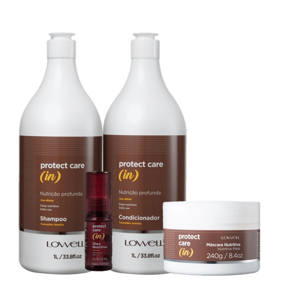 O Kit Lowell Protect Care (in) Dupla Nutrição contém em suas fórmulas em ativos que nutrem e conferem maciez ao cabelo. Além disso, restaura a vitalidade e o brilho das madeixas. Itens ideais para o cuidado diário com os fios! Este Kit Contém Lowell Protect Care (in) - Shampoo Nutritivo 1L: limpa os fios de modo suave, nutre, confere maciez, toque acetinado e menos frizz. Lowell Protect Care (in) - Condicionador Nutritivo 1L: repõe vitaminas essenciais que nutrem, condicionam e restauram a maciez do cabelo. Lowell Protect Care (in) - Máscara Capilar Nutritiva 240g: garante nutrição profunda e rápida, elimina o frizz, porosidade e confere brilho aos fios. Lowell Protect Care (in) - Óleo Nutritivo 30ml: repõe a camada lipídica e devolve os nutrientes dos fios. Como Usar Conselho de Aplicação Shampoo: Com o cabelo molhado, aplique o shampoo e massageie. Enxágue e repita a aplicação. Condicionador: Com os fios limpos, aplique o condicionador no comprimento e pontas e massageie. Deixe agir por cinco minutos e enxágue. Máscara Capilar: com o cabelo limpo, aplique a máscara no comprimento e pontas e massageie. Deixe agir por cinco minutos e enxágue. Óleo Capilar: aplique no comprimento e pontas e distribua de maneira uniforme. Pode ser aplicado no cabelo seco ou úmido. Sem enxágue. Kit Lowell Protect Care (in) Cabelos Sem Vida (4 Produtos)