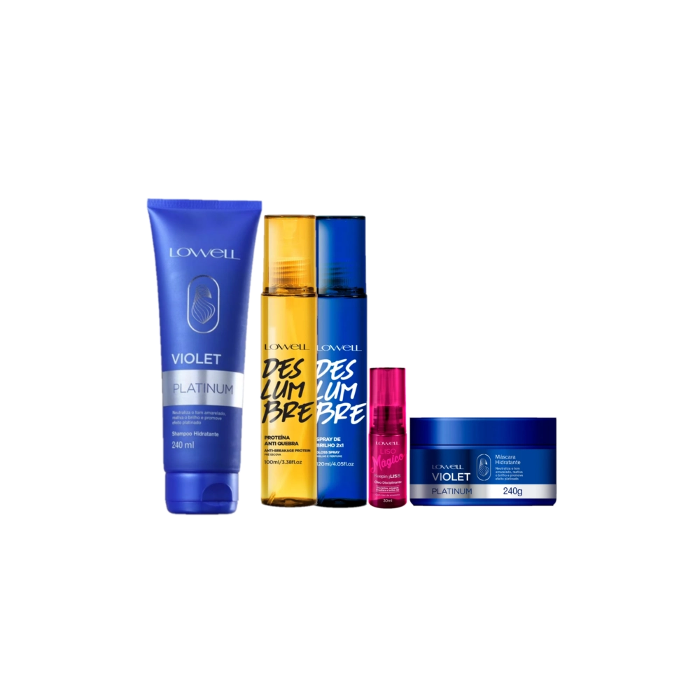 Este Kit Contém Lowell Violet Platinum - Shampoo 240ml: shampoo matizador hidratante rico em pigmento violeta acinzentado, neutraliza o tom amarelado e dá brilho. Sendo uma linha ainda mais aprimorada para o cuidado dos cabelos loiros. Entrega cabelos matizados, livres de reflexos amarelados e alaranjados indesejados, ao mesmo tempo que promove hidratação e efeito platinado. Lowell Violet Platinum - Máscara Matizadora 240g: máscara hidratante matizadora, promove efeito platinado, neutraliza os tons amarelados e dá brilho. Reativa o brilho do cabelo com sua alta concentração de pigmentos violetas acinzentados hidratantes, além de matizar os fios. Lowell Deslumbre - Spray de Brilho 2x1 120ml: oferece uma finalização perfeita do penteado. Com ele, seu visual ganha um brilho incrível e fica protegido dos maus odores causados pela poluição, cigarros, entre outros. Seu cabelo fica com um brilho intenso e levemente perfumado. Lowell Deslumbre - Proteína Antiquebra 100ml: permite que seu cabelo seja escovado sem nenhuma quebra. Possui efeito antiestético, que deixa o fio alinhado e disciplinado. Sua fórmula não pesa e não acumula no cabelo, além de proteger dos efeitos nocivos da poluição. Lowell Keeping Liss Liso Mágico - Óleo Capilar 30ml: para todos os tipos de cabelo. Protege os fios do frizz com a selagem das cutículas e brilho 3D. Forma um filme sobre os fios que mantém o cabelo comportado e longe dos arrepiados, além de ser rico em antioxidantes que protegem a cor do desbotamento e a perda de nutrientes pela fibra capilar. Tudo com brilho tridimensional que reluz com o movimento do cabelo. Conselho de Aplicação Shampoo: com os cabelos limpos e úmidos, aplique o shampoo massageando o couro cabeludo e espalhando pelo comprimento dos cabelos. Enxague completamente. Máscara: com ajuda de uma espátula, para evitar contaminação do produto, pegue uma quantidade e aplique com as mãos nos fios limpos e úmidos, mecha a mecha por todo o comprimento. Deixe agir de 1 a 5 minutos e enxague completamente o produto. Spray de brilho: borrife o spray no cabelo seco a 15 cm de distância. Spray antiquebra: borrife diretamente no cabelo úmido e prossiga com a escovação. Óleo: aplique algumas gotinhas do óleo na palma das mãos e distribua uniformemente pelo comprimento e pontas do cabelo úmido ou após a escovação e prancha. Kit Lowell Violet Platinum Deslumbre Liso Mágico Máscara Matizadora e Proteína Antiquebra (5 produtos)