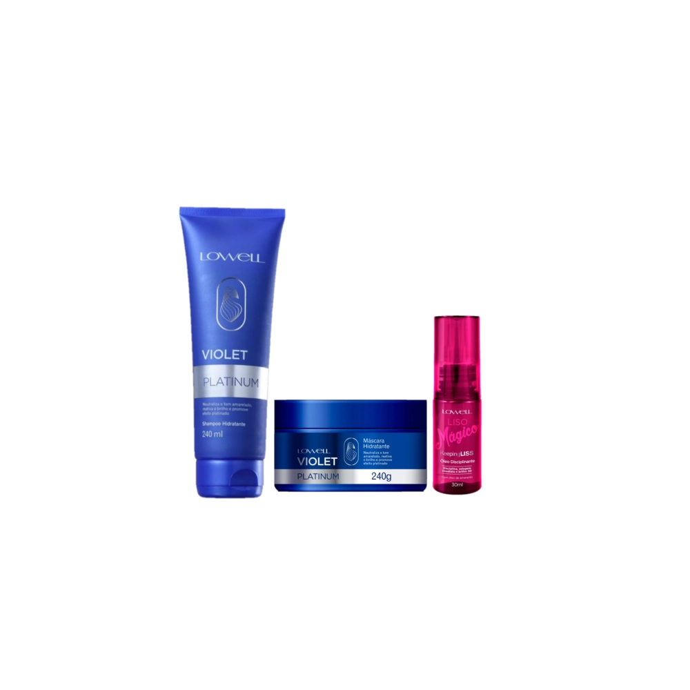Este Kit Contém Lowell Violet Platinum - Shampoo 240ml: shampoo matizador hidratante rico em pigmento violeta acinzentado, neutraliza o tom amarelado e dá brilho. Sendo uma linha ainda mais aprimorada para o cuidado dos cabelos loiros. Entrega cabelos matizados, livres de reflexos amarelados e alaranjados indesejados, ao mesmo tempo que promove hidratação e efeito platinado. Lowell Violet Platinum - Máscara Matizadora 240g: máscara hidratante matizadora, promove efeito platinado, neutraliza os tons amarelados e dá brilho. Reativa o brilho do cabelo com sua alta concentração de pigmentos violetas acinzentados hidratantes, além de matizar os fios. Lowell Keeping Liss Liso Mágico - Óleo Capilar 30ml: para todos os tipos de cabelo. Protege os fios do frizz com a selagem das cutículas e brilho 3D. Forma um filme sobre os fios que mantém o cabelo comportado e longe dos arrepiados, além de ser rico em antioxidantes que protegem a cor do desbotamento e a perda de nutrientes pela fibra capilar. Tudo com brilho tridimensional que reluz com o movimento do cabelo. Conselho de Aplicação Shampoo: com os cabelos limpos e úmidos, aplique o shampoo massageando o couro cabeludo e espalhando pelo comprimento dos cabelos. Enxague completamente. Máscara: com ajuda de uma espátula, para evitar contaminação do produto, pegue uma quantidade e aplique com as mãos nos fios limpos e úmidos, mecha a mecha por todo o comprimento. Deixe agir de 1 a 5 minutos e enxague completamente o produto. Óleo: aplique algumas gotinhas do óleo na palma das mãos e distribua uniformemente pelo comprimento e pontas do cabelo úmido ou após a escovação e prancha. Kit Lowell Violet Platinum Liso Mágico e Máscara Matizadora (3 produtos)