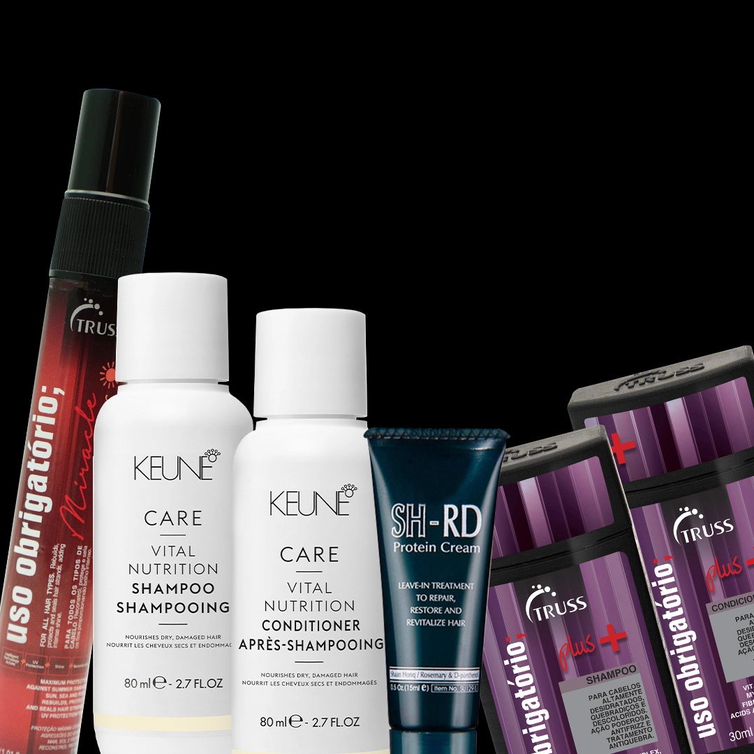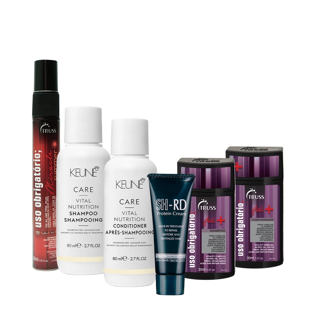 Este Kit Contém Keune Care Vital Nutrition - Shampoo 80ml: recomendado para cabelos secos, porosos e danificados, o Care Vital Nutrition Shampoo limpa, hidrata e dá leveza aos fios, especialmente aqueles que receberam recentemente mechas ou descoloração. Isso porque sua fórmula é rica em proteínas e vitaminas que protegem, nutrem, regulam a umidade e melhoram a penteabilidade. Keune Care Vital Nutrition - Condicionador 80ml: para cabelos secos, porosos e danificados, o Care Vital Nutrition Conditioner hidrata, restaura e devolve a vitalidade a esse tipo de cabelo. Possui tecnologia Nutri Injection que regenera a umidade, dá energia ao fio opaco e sem vida e não o deixa pesado. Vital Nutrition reconstrói a fibra capilar e dá corpo aos fios, em uma transformação interna, silenciosa e permanente. Truss Uso Obrigatório Plus - Shampoo 30ml: limpa suavemente, reduzindo os danos em cabelos com química, hidrata e sela as cutículas. Promove suavidade e brilho aos fios. Truss Uso Obrigatório Plus - Condicionador 30ml: hidrata, reduzindo os danos em cabelo com química e sela as cutículas. Possui ação antidesbotamento. N.P.P.E SH-RD Proteína - Leave-in de Tratamento 5ml: restaurador diário para cabelos porosos e com pontas duplas. Recupera dos danos e hidrata. Também torna os fios mais fortes e saudáveis, com melhor aparência. Truss Uso Obrigatório Summer - Reconstrutor 30ml: tratamento reconstrutor para todos os tipos de cabelo expostos ao mar, sol e piscina. Protege e recupera os fios depois das agressões do verão. Sugestão de Aplicação Shampoo: aplique o shampoo no couro cabeludo úmido, massageie até formar espuma, distribua entre os fios, deixe agir por 2 minutos e enxágue completamente. Caso necessário, repita o procedimento. Condicionador: lave o cabelo com shampoo, espalhe o condicionador no comprimento e pontas dos fios. Deixe agir por 3 minutos e enxágue. Proteína Leave-in: após lavar o cabelo, retire o excesso de água com uma toalha e aplique o leave-in sobre os fios. Use as duas mãos para espalhar por todo o comprimento, mas evite a raiz. Depois, penteie e finalize da maneira que você desejar. Reconstrutor: agite bem o produto e aplique em toda a extensão dos fios antes da exposição ao sol, mar ou piscina. Reaplique ao longo do dia. Você também pode usá-lo entre o seu shampoo e condicionador, como um tratamento reconstrutor. Kit Miniaturas Tratamento (6 produtos)