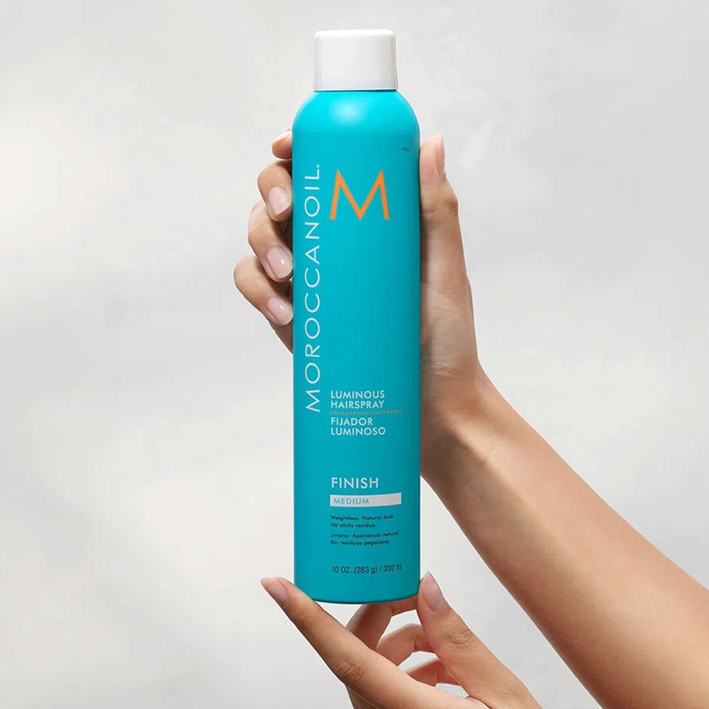Segurar a lata do Spray Fixador Luminoso Moroccanoil a 25 cm do cabelo e pulverizar para uma fixação forte.