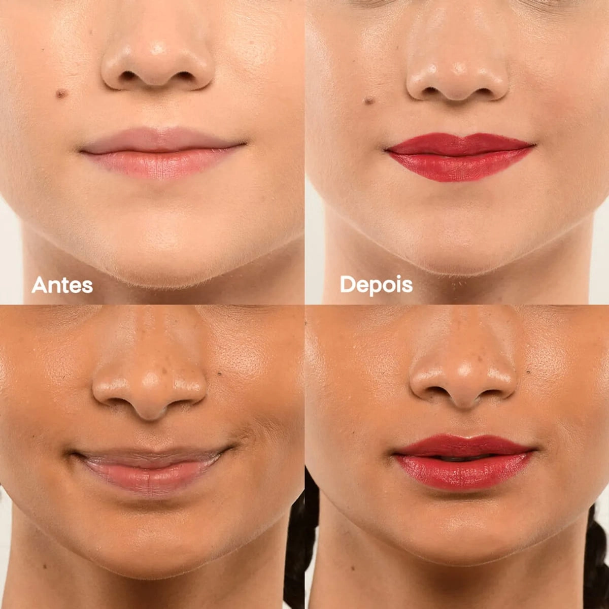 Lip Pen: com a ponta, desenhe o contorno da boca. Comece pelo arco do cupido, lábio inferior e depois delineie os cantos. Em seguida, preencha o centro.