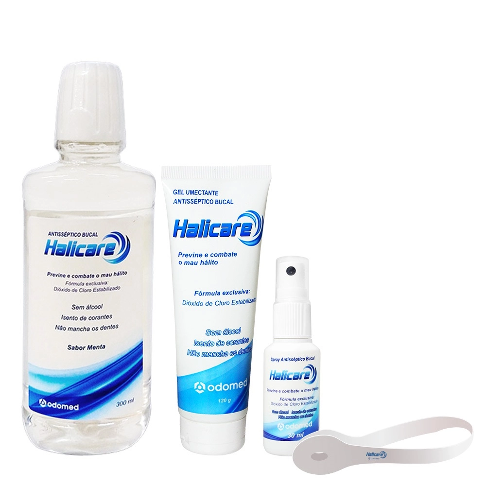 Trata-se de um antimicrobiano e bactericida de largo espectro com a ação eficaz na prevenção e combate a infecções bucais. Os produtos que possuem como princípio ativo o Dióxido de Cloro Estabilizado agem no organismo por meio de três mecanismos diferentes. Este Kit Contém Odomed Halicare - Enxaguante Antisseptico Bucal 300ml: Foi desenvolvido especialmente para prevenir e combater as infecções bucais, protegendo sua boca da ação das bactérias que causam uma série de doenças, através de sua fórmula exclusiva a base de dióxido de cloro estabilizado. Odomed - Limpador de Lingua: desenvolvido para tornar a limpeza da língua eficiente, de maneira simples e sem causar desconforto. Sua espessura e flexibilidade permitem que seja utilizado abrangendo a língua por completa evitando desconforto. Possui uma pequena área serrilhada que elimina a saburra lingual sem causar ferimentos ou irritação na língua. Odomed Halicare - Gel Umectante Antisseptico 120g: possui o mesmo princípio ativo protetor do Enxaguante Halicare. Sua grande vantagem é que, além dos já mencionados benefícios, é um excelente lubrificante bucal, deixando a boca umedecida e refrescante. Odomed Halicare - Spray Antisseptico Bucal 30ml: complementa a utilização do Enxaguante. Seu formato permite que ele seja levado a qualquer lugar,na bolsa ou no bolso. Como Usar Conselho de Aplicação Enxaguante: O Enxaguante Halicare possui tampa dosadora. Coloque de 5 a 10 ml na boca e faça vários gargarejos. Fazer gargarejos é muito importante para o processo de limpeza da língua e da garganta. O gargarejo e/ou bochecho deve ser realizado durante um minuto. Ao final do procedimento cuspa o produto. Após realizar o procedimento, fique durante 30 minutos sem comer ou beber. Portanto, o Enxaguante Halicare deve ser o último procedimento de sua higienização bucal. Limpador: O Limpador Halicare deve ser dobrado com o logotipo para o lado de fora. Coloque-se de frente para o espelho para facilitar a limpeza da língua, que deve ser feita em três etapas: Terço Lateral Direito: inicie a limpeza na parte direita da língua. Coloque o raspador no fundo da língua e arraste a massa de células, bactérias e muco até a ponta da língua. Terço Lateral Esquerdo: inicie a limpeza da parte esquerda da língua. O movimento também deve ser realizado vinte vezes.Novamente, os movimentos devem ser delicados e eficientes. Terço Central: na região central da língua, o raspador deve ser colocado o mais fundo possível. A limpeza deve ser realizada com mais delicadeza porque essa região é formada de papilas mais altas do que as regiões anteriores. Gel: Devem ser espalhados 2 a 3 gramas (g) do Gel Umectante Halicare por toda a boca, inclusive nos dentes. Spray: A aplicação do Spray Halicare é realizada por um jato de spray diretamente na parte central da língua. Kit Odomed Halicare Higiene Bucal Completa (4 Produtos)