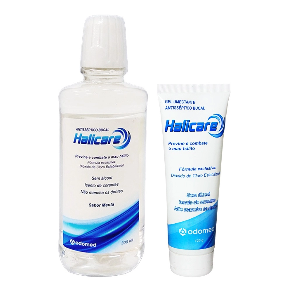 A Linha Halicare tem ação antibacteriana, protegendo sua boca de bactérias e microorganismos infecciosos, ao mesmo tempo tem ação refrescante e hidratante Este Kit Contém Odomed Halicare - Enxaguante Antisseptico Bucal 300ml: Foi desenvolvido especialmente para prevenir e combater as infecções bucais, protegendo sua boca da ação das bactérias que causam uma série de doenças. Como não possui contra indicação de uso, é um eficiente complemento diário na higienização bucal. Graças a sua ação protetora contra bactérias tem se mostrado um agente importante em: Amigdalites, cáseos amigdalíticos, mucosites, lesões causadas por ressecamento e descamação bucal, assepsia em procedimentos pré e pós clínicos e cirúrgicos na cavidade bucal, periodontites, mau hálito, etc. Odomed Halicare - Gel Umectante Antisseptico Bucal 120g: O Gel Umectante Halicare possui o mesmo princípio ativo protetor do Enxaguante Halicare. Sua grande vantagem é que, além dos já mencionados benefícios, é um excelente lubrificante bucal, deixando a boca umedecida e refrescante. É indicado principalmente em casos de descontaminação do sulco gengival, pacientes que usam aparelhos Ortodônticos, descamação e ressecamento bucal constante, pacientes respiradores bucais e que realizam rádio e quimioterapias, pacientes que utilizam medicamentos regularmente (diabetes, hipertensão, emagrecimento, entre outros. Como Usar Conselho de Aplicação Enxaguante: O Enxaguante Halicare possui tampa dosadora. Coloque de 5 a 10 ml na boca e faça vários gargarejos. Fazer gargarejos é muito importante para o processo de limpeza da língua e da garganta. O gargarejo e/ou bochecho deve ser realizado durante um minuto. Ao final do procedimento cuspa o produto. Após realizar o procedimento, fique durante 30 minutos sem comer ou beber. Portanto, o Enxaguante Halicare deve ser o último procedimento de sua higienização bucal. Gel: Devem ser espalhados 2 a 3 gramas (g) do Gel Umectante Halicare por toda a boca, inclusive nos dentes. O Gel Umectante Halicare protege a boca também da desidratação e ressecamento noturno e da possível descamação da mucosa. Neste caso, esse procedimento deve ser realizado antes de dormir para que durante o sono o gel permaneça agindo na boca. Kit Odomed Halicare Protecao Bucal (2 Produtos)