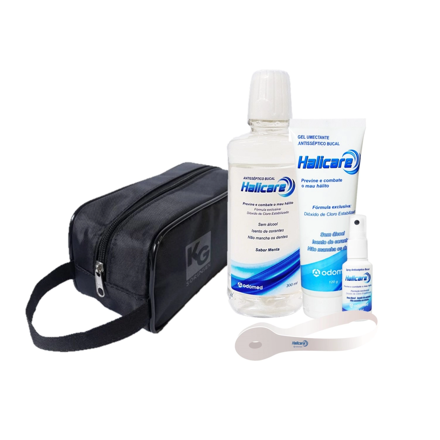 Kit Odomed Halicare Tratamento Higiene Bucal Completa (5 Produtos) Este Kit Contém: Odomed Halicare - Enxaguante Antisséptico Bucal 300ml: desenvolvido especialmente para prevenir e combater as infecções bucais, protegendo sua boca da ação das bactérias que causam uma série de doenças, através de sua fórmula exclusiva a base de dióxido de cloro estabilizado. Odomed - Limpador de Língua: desenvolvido para tornar a limpeza da língua eficiente, de maneira simples e sem causar desconforto. Sua espessura e flexibilidade permitem que seja utilizado abrangendo a língua por completa evitando desconforto. Possui uma pequena área serrilhada que elimina a saburra lingual sem causar ferimentos ou irritação na língua. Odomed Halicare - Gel Umectante Antisséptico 120g: possui o mesmo princípio ativo protetor do Enxaguante Halicare. Sua grande vantagem é que, além dos já mencionados benefícios, é um excelente lubrificante bucal, deixando a boca umedecida e refrescante. Odomed Halicare - Spray Antisséptico Bucal 30ml: complementa a utilização do Enxaguante. Seu formato permite que ele seja levado a qualquer lugar, na bolsa ou no bolso. Odomed Halicare – Necessaire: ítem enviado como organizador (cortesia) Conselho de Aplicação Enxaguante: o Enxaguante Halicare possui tampa dosadora. Coloque de 5 a 10 ml na boca e faça vários gargarejos. Fazer gargarejos é muito importante para o processo de limpeza da língua e da garganta. O gargarejo e/ou bochecho deve ser realizado durante um minuto. Ao final do procedimento cuspa o produto. Após realizar o procedimento, fique durante 30 minutos sem comer ou beber. Portanto, o Enxaguante Halicare deve ser o último procedimento de sua higienização bucal.