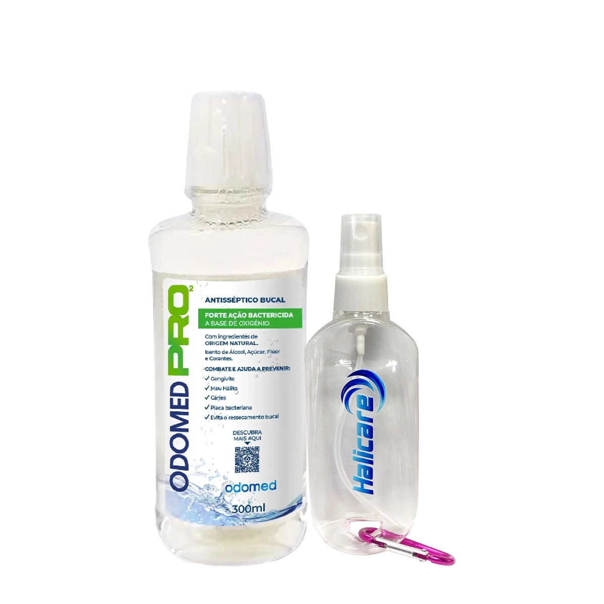 Este Kit Contém Odomed Pro2 Antisséptico - Enxaguante Bucal 300ml: é um enxaguante bucal com fórmula exclusiva à base de dióxido de cloro estabilizado, que combate infecções, elimina bactérias e promove uma higienização profunda da boca. Ideal para auxiliar no tratamento de amigdalites, cáseos, mau hálito, lesões, mucosites e inflamações periodontais. Sem contraindicações, é o aliado perfeito para manter a saúde bucal em dia com segurança e eficácia. Brinde Odomed Halicare Dispenser Spray Borrifador Travel Size: mini borrifador, ideal para acompanhar você em todos os lugares. Conselho de AplicaçãoOdomed Pro2 Antisséptico Bucal - Proteção Bucal Completa