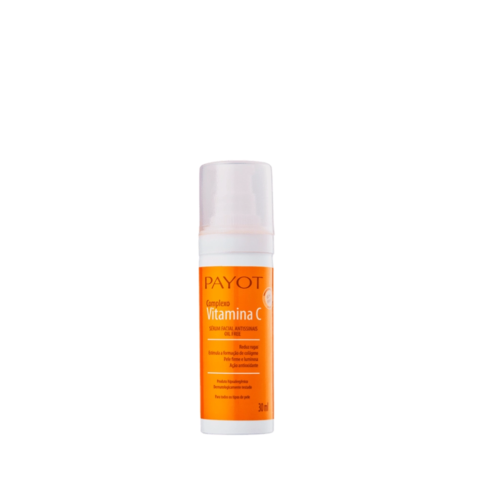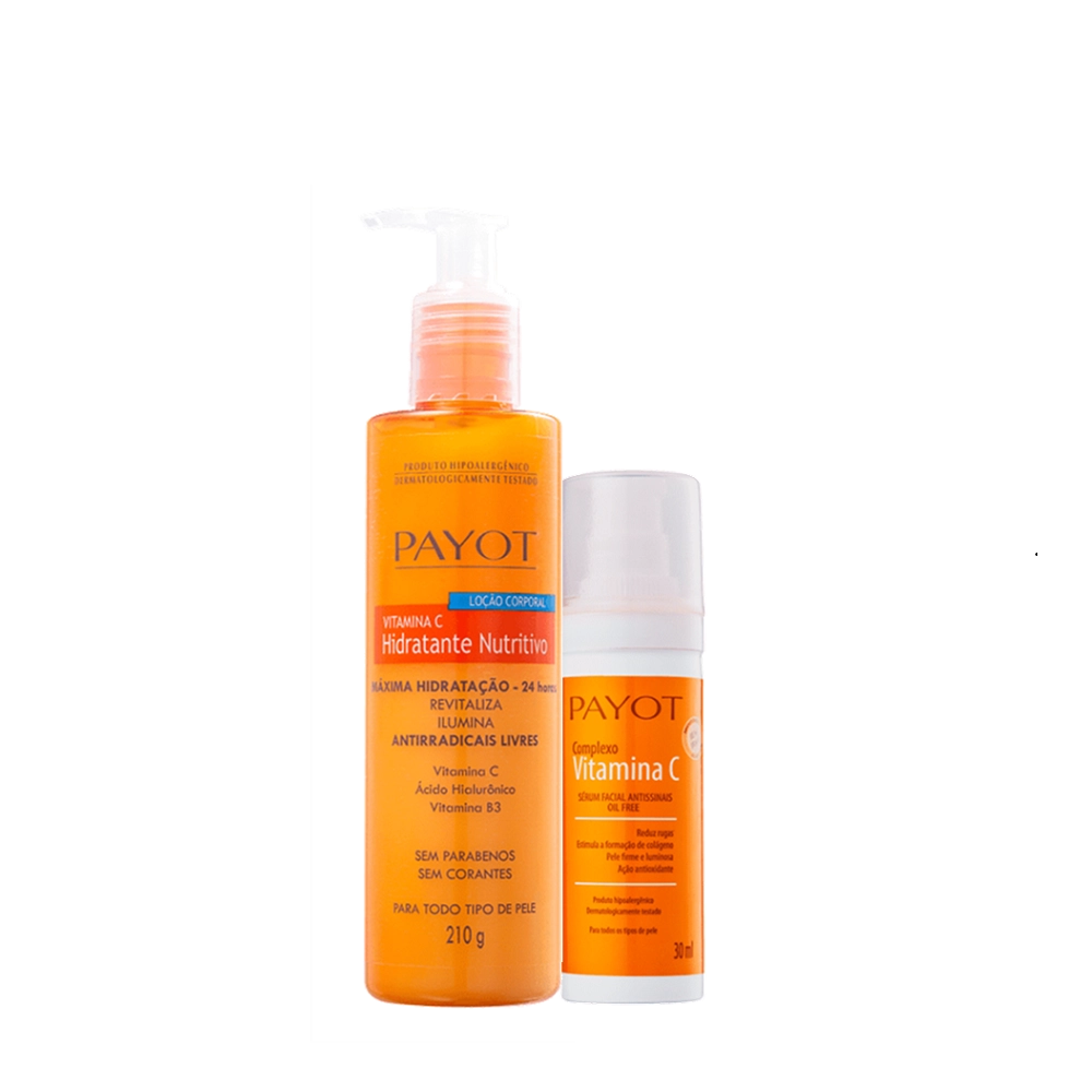 O Complexo Vitamina C, da Payot, penetra profundamente na pele para estimular a produção de colágeno, melhorar a elasticidade e deixar uma aparência jovem e fresca. Combate a ação dos radicais livres para evitar o surgimento de rugas e linhas finas, além de atenuar as já existentes.Ação Loção hidratante Payot Vitamina C Nutritivo Corporal mantém a pele protegida, suaviza e garante sensação confortável. Além disso, restaura a vitalidade e deixa um toque aveludado no corpo. Ideal para quem deseja melhorar a qualidade da pele. Produto hipoalergênico. Contém Payot Complexo Vitamina C - Sérum Anti-Idade 30ml: para todos os tipos de pele, confere firmeza, luminosidade e hidratação intensa, além de reduzir a aparência dos sinais de idade e prevenir o envelhecimento precoce. Payot Complexo Vitamina C - Loção Hidratante Corporal 210g: promove maciez, ajuda a manter elasticidade e estimula a manutenção do colágeno. Como Usar Conselho de aplicação Aplique o serum anti-idade sobre a pele limpa, de maneira uniforme, pela manhã e pela noite. Aplique a loção hidratante no corpo e massageie até a absorção do produto. Passe o hidratante logo após o banho, pois, nesse momento, os poros da pele ainda estão um pouco mais abertos, o que facilita a penetração da fórmula. Payot Complexo Vitamina C Sérum Anti-Idade 30ml e Loção Hidratante Corporal 210g