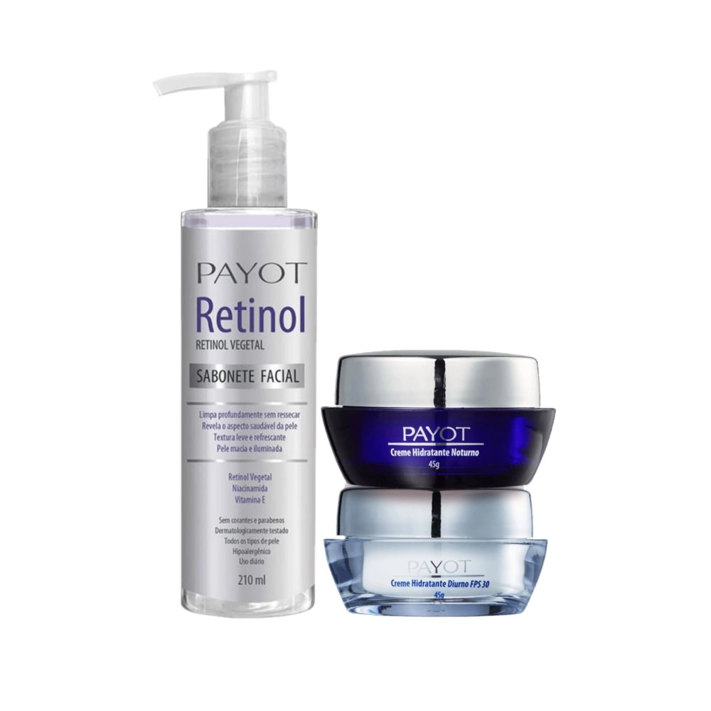 Testes clínicos comprovam: 91% rápida absorção, 88% pele mais hidratada e macia, 81% pele mais firme, 78%redução de linhas finas de expressão. O Payot Creme Hidratante Diurno FPS30 e Creme Hidratante Noturno promovem hidratação profunda e prolongada. Suas fórmulas possuem proteção contra raios solares UVA e UVB e combinam ingredientes com Ácido Hialurônico e Prebióticos, que ajudam a reduzir linhas finas de expressão e regulam a umidade da pele. Este kit contém: Payot Creme Hidratante Diurno FPS30 45g: Com Ácido Hialurônico e Oligoelementos, ativo composto por sais minerais que revitalizam e uniformizam a pele. A combinação destes ingredientes melhora a firmeza e o aspecto da pele cansada, nutrindo e hidratando intensamente ao longo do dia. Rápida absorção. Textura suave. Payot Creme Hidratante Noturno 45g: Devolve à pele a luminosidade natural, a suavidade e maciez. Pantenol (que possui poderosa ação hidratante); Payout Retinol Facial - Sabonete Líquido 210ml: Limpa profundamente sem ressecar a pele. Sua fórmula revitalizante minimiza a oleosidade. Mantém a pele macia e iluminda ao longo do dia. A combinação de Retinol Vegetal, Niacinamida e Vitamina E ajuda a hidratar, proteger e promover a aparência de uma pele renovada. Possui uma textura leve e espuma cremosa. Produto livre de parabenos e corantes. Conselho de Aplicação Creme Hidratante Diurno: com o rosto limpo e seco aplicar na face e pescoço, massageando suavemente até sua completa absorção. Pode ser reaplicado ao longo do dia, para manter sua pele protegida e hidratada. Creme Hidratante Noturno: com o rosto limpo e seco aplicar na face até completa absorção, fazendo movimentos circulares. Uso noturno podendo dormir com o produto após aplicação.Kit Payot Hidratante Diurno e Noturno Retinol (3 produtos)
