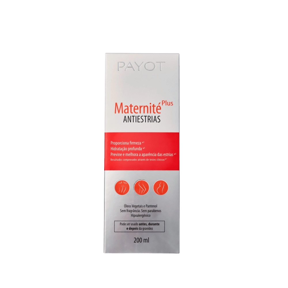 Creme antiestrias. Payot Maternité Plus restaura a elasticidade e firmeza da pele, deixando uma aparência mais bonita. O Creme Antiestrias Payot Maternité Plus tem em sua composição óleos vegetais e pantenol que fortalecem as fibras elásticas e o colágeno. Garante uma hidratação e nutrição profunda da derme, deixando-a macia ao toque. Como Usar Conselho de Aplicação Aplique o produto sobre a pele limpa e seca duas vezes ao dia, massageie suavemente até a absorção total do produto, principalmente nas áreas mais suscetíveis a estrias. Kit Payot Maternite Plus - Creme Antiestrias 200ml