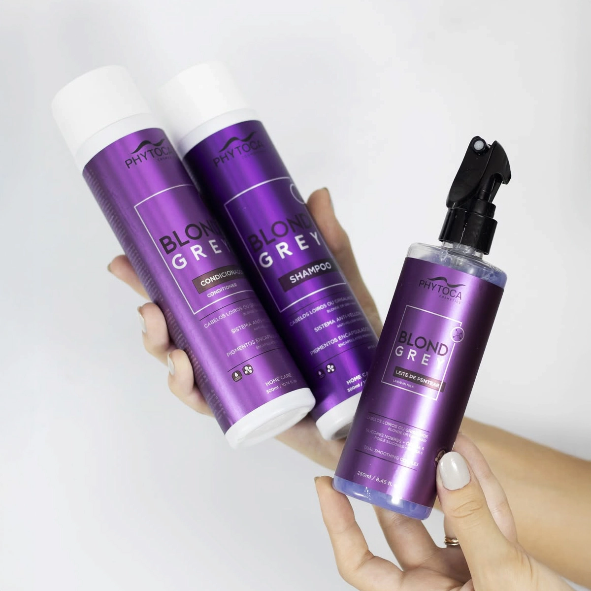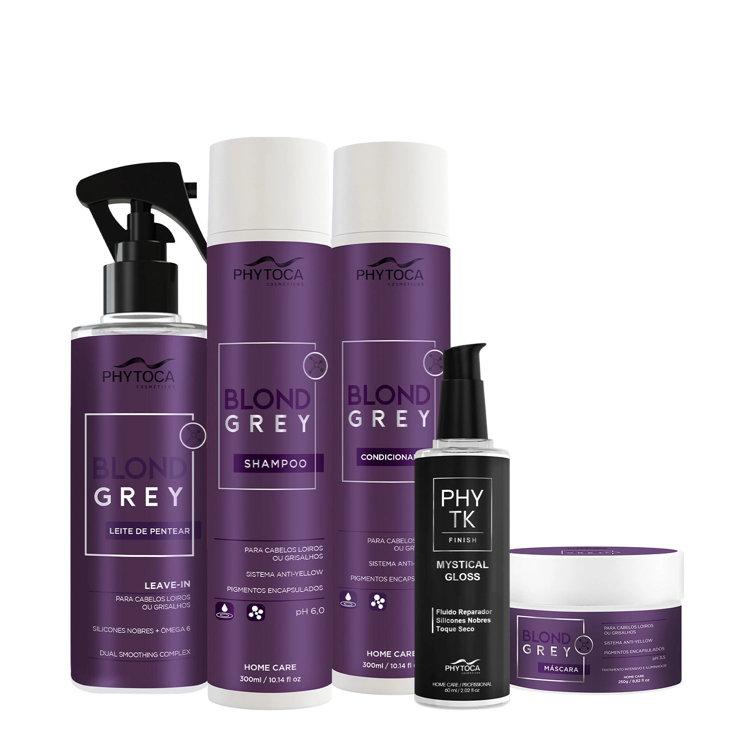 Kit Phytoca Cosmetics Blond Grey Hair Care Total (5 produtos) Este Kit Contém Phytoca Cosmetics Blond Grey - Shampoo 300ml: promove uma limpeza suave e a manutenção do loiro, proporcionando uma cor uniforme, bonita e sem tons indesejados. Formulado com um complexo de pigmentos, neutraliza tons amarelados, confere um platinado perfeito, com cor duradoura e fios revitalizados. Phytoca Cosmetics Blond Grey - Condicionador 300ml: hidrata e corrige tons indesejados, revelando gradualmente tons platinados. Sua fórmula altamente nutritiva, garante brilho intenso, fios renovados e um tom uniforme prolongado. Phytoca Cosmetics Blond Grey - Máscara Capilar 250g: garante uma cor uniforme e duradoura, livre de tons amarelados. Sua fórmula altamente nutritiva, revitaliza, hidrata e confere brilho intenso aos fios. Phytoca Cosmetics Blond Grey Leite de Pentear - Leave-in 250ml: proporciona brilho intenso, proteção térmica e fácil desembaraçar. Sua fórmula leve, enriquecida com ômega 6, silicones nobres e dual smoothing complex, garante fios brilhosos, sem frizz e com toque sedoso. Phytoca Cosmetics Mystical Gloss - Fluído Reparador 60ml: possui ativos emolientes, textura leve e eficaz. Repara, previne pontas dupla e protege o cabelo contra agressões externas. Proporciona sedosidade, luminosidade, fios intensamente brilhantes e sem frizz.